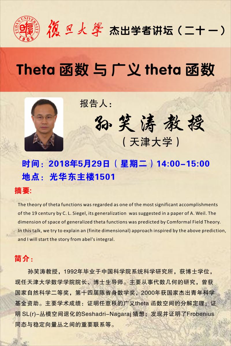 简介:孙笑涛教授,1992年毕业于中国科学院系统科学研究所,获博士学位,现任天津大学数学学院院长、博士生导师。主要从事代数几何的研究,曾获国家自然科学二等奖1项(唯一完成人),获第十四届陈省身数学奖,获200国家杰出青年科学基金。主要学术成绩:证明任意秩的广义theta 函数空间的分解定理;证明 SL(r)-丛模空间退化的Seshadri-Nagaraj 猜想;发现并证明了Frobenius同态与稳定向量丛之间的重要联系等。