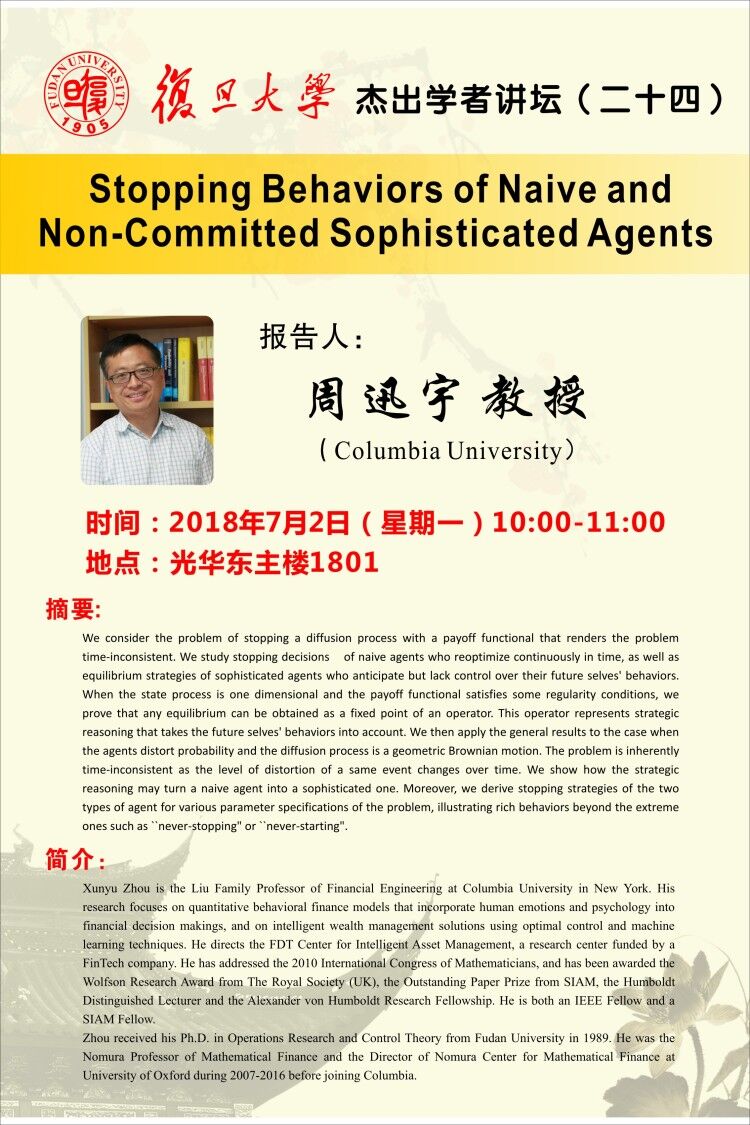 简介:Xunyu Zhou is the Liu Family Professor of Financial Engineering at Columbia University in New York. His research focuses on quantitative behavioral finance models that incorporate human emotions and psychology into financial decision makings, and on intelligent wealth management solutions using optimal control and machine learning techniques. He directs the FDT Center for Intelligent Asset Management, a research center funded by a FinTech company. He has addressed the 2010 International Congress of Mathematicians, and has been awarded the Wolfson Research Award from The Royal Society (UK), the Outstanding Paper Prize from SIAM, the Humboldt Distinguished Lecturer and the Alexander von Humboldt Research Fellowship. He is both an IEEE Fellow and a SIAM Fellow.