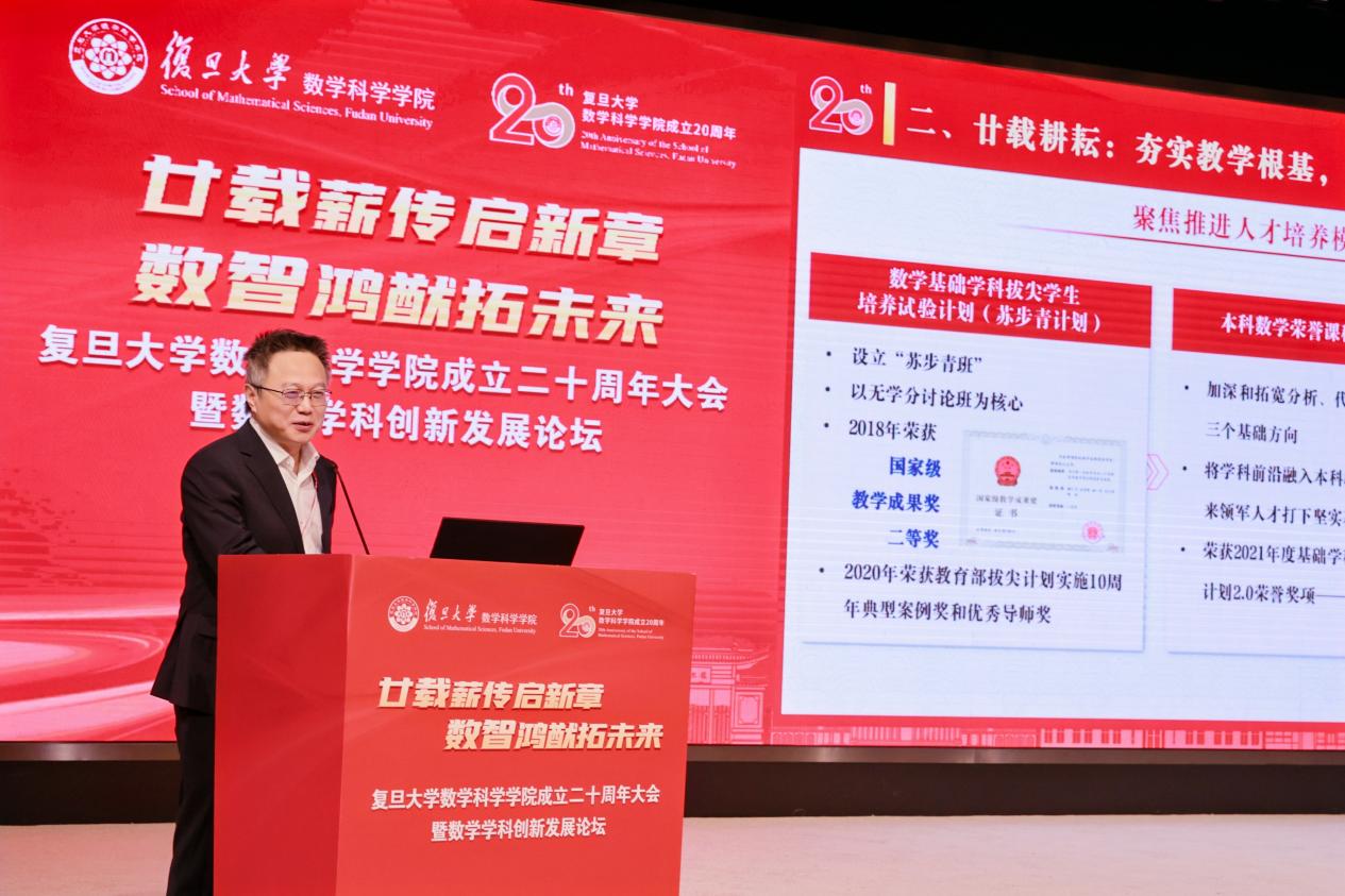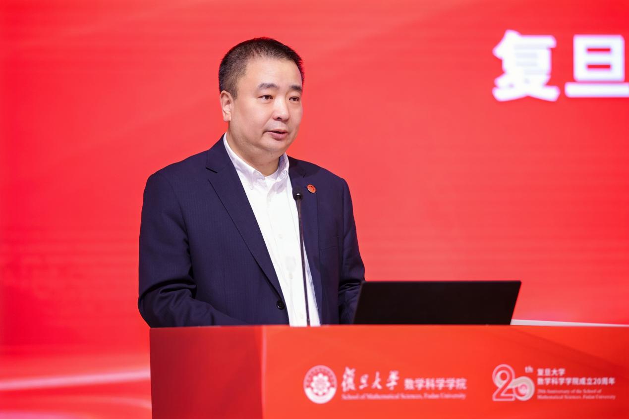 金力向数学科学学院全体师生员工、海内外校友表示热烈祝贺,并向长期以来关心、支持复旦数学学院发展的社会各界人士表示衷心感谢。他指出,数学是自然科学的基础,也是重大技术创新发展的根基。他充分肯定了数学学院过去20年来在立德树人、人才引育、科学研究和学科建设等方面取得的成就,表示复旦大学将继续全力支持数学学院,并对数学学院提出了三点期望:厚植拔尖创新沃土,在培养“干细胞式”拔尖创新人才上走在前列;聚焦国家重大战略需求,在打造数学创新策源地上奋勇争先;走高质量发展之路,在推进“三位一体”综合改革上打样示范。