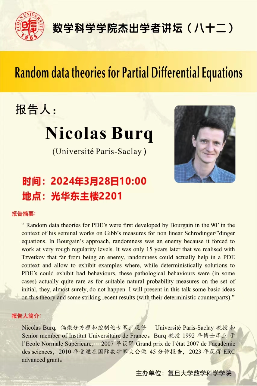 “ Random data theories for PDE’s were first developed by Bourgain in the 90’ in the context of his seminal works on Gibb’s measures for non linear Schrodinger\”dinger equations. In Bourgain’s approach, randomness was an enemy because it forced to work at very rough regularity levels. It was only 15 years later that we realised with Tzvetkov that far from being an enemy, randomness could actually help in a PDE context and allow to exhibit examples where, while deterministically solutions to PDE’s could exhibit bad behaviours, these pathological behaviours were (in some cases) actually quite rare as for suitable natural probability measures on the set of initial, they, almost surely, do not happen. I will present in this talk some basic ideas on this theory and some striking recent results (with their deterministic counterparts).”