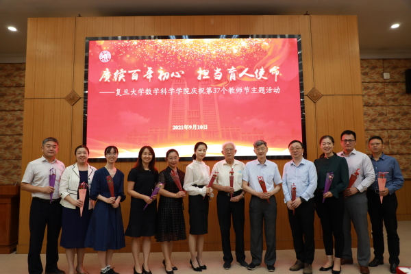 陆颖丰副处长首先向各位教师致以节日的问候。她表示,十分感谢在座企业在复旦设立了多项奖教金,给教师发展创造良好条件,为教师教学科研提供了有力支撑,有力助推了数学学科的发展。作为学校基金会,深刻感受到数学学院高度重视教师工作,把关爱教师放在第一位,积极拓展社会资源,为全校尊师重教起到了标杆作用。希望学院继续夯实教师队伍建设,更好服务人民需要。随后宣读2020年度刘宁侯明华教学发展基金、兴证全球责任奖教金、领航基金、新纪元奖教金、韬睿惠悦奖教金、太平-复旦奖教金获奖名单。