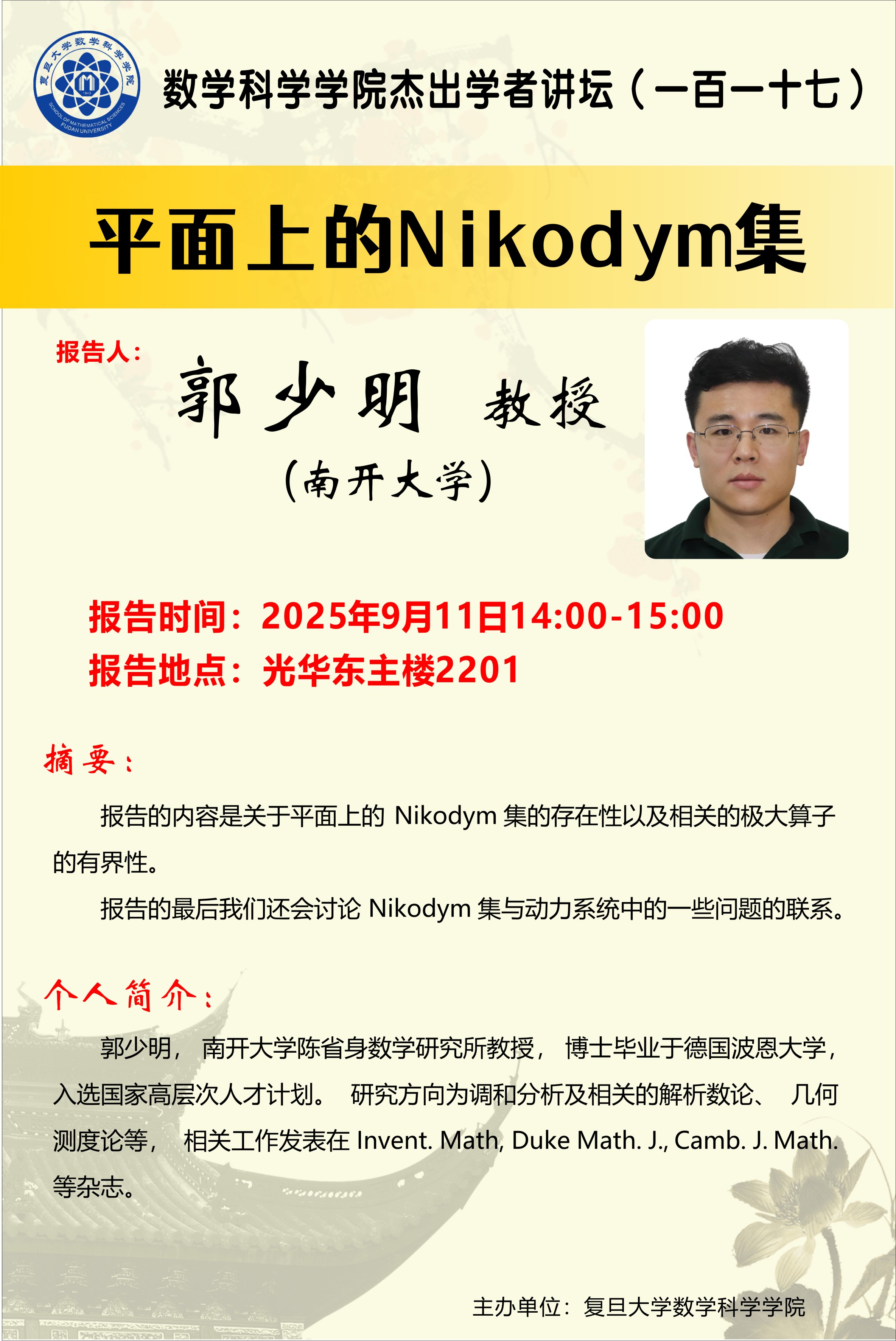 个人简介:郭少明, 南开大学陈省身数学研究所教授, 博士毕业于德国波恩大学, 入选国家高层次人才计划。 研究方向为调和分析及相关的解析数论、 几何测度论等, 相关工作发表在Invent. Math, Duke Math. J., Camb. J. Math. 等杂志。
