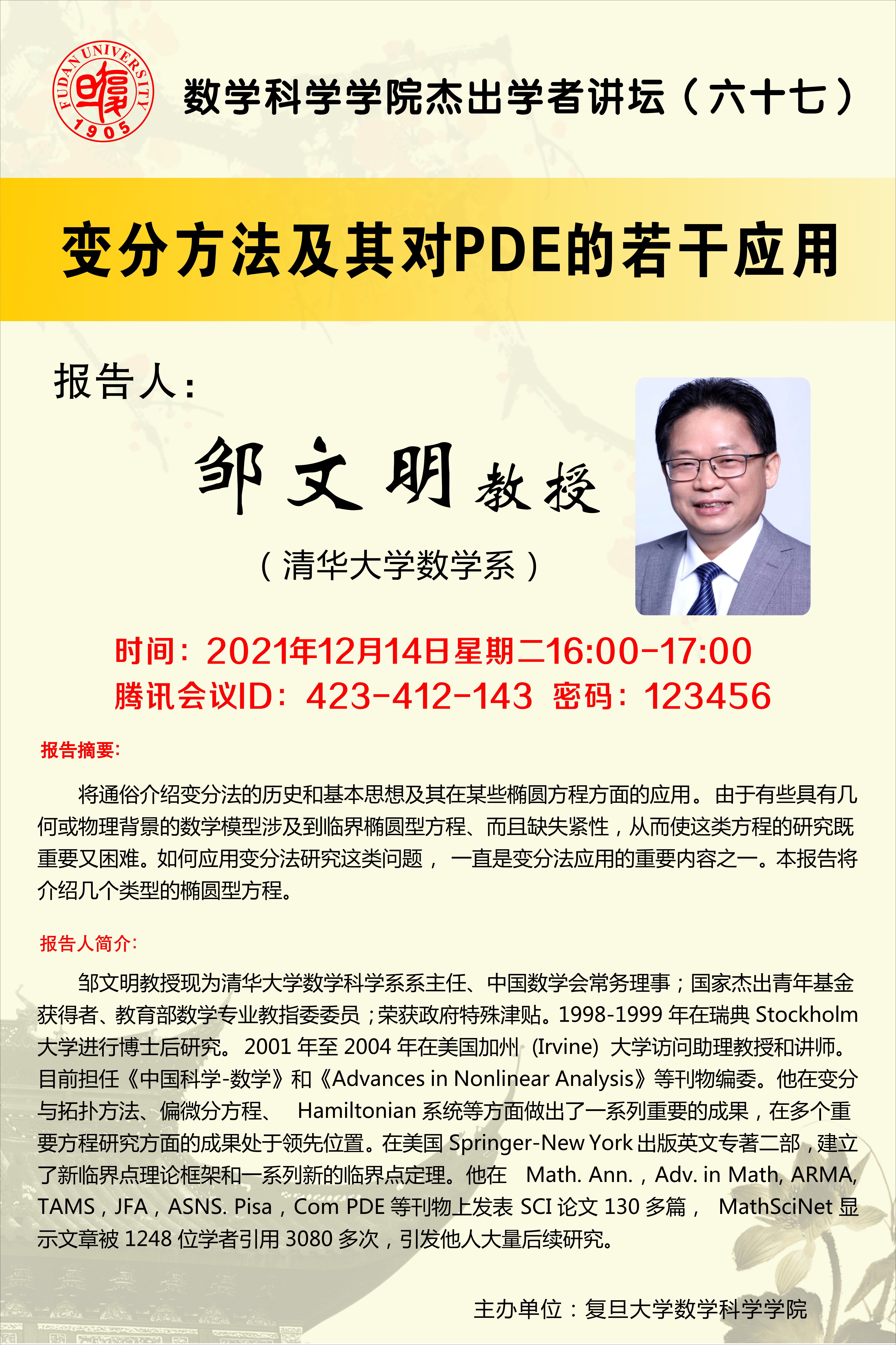 将通俗介绍变分法的历史和基本思想及其在某些椭圆方程方面的应用。由于有些具有几何或物理背景的数学模型涉及到临界椭圆型方程、而且缺失紧性,从而使这类方程的研究既重要又困难。如何应用变分法研究这类问题,一直是变分法应用的重要内容之一。本报告将介绍几个类型的椭圆型方程。