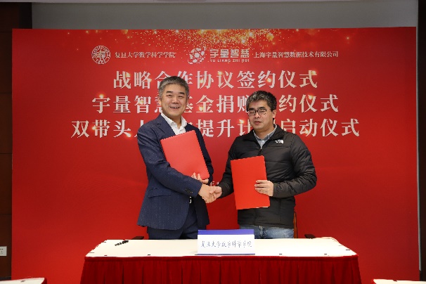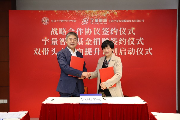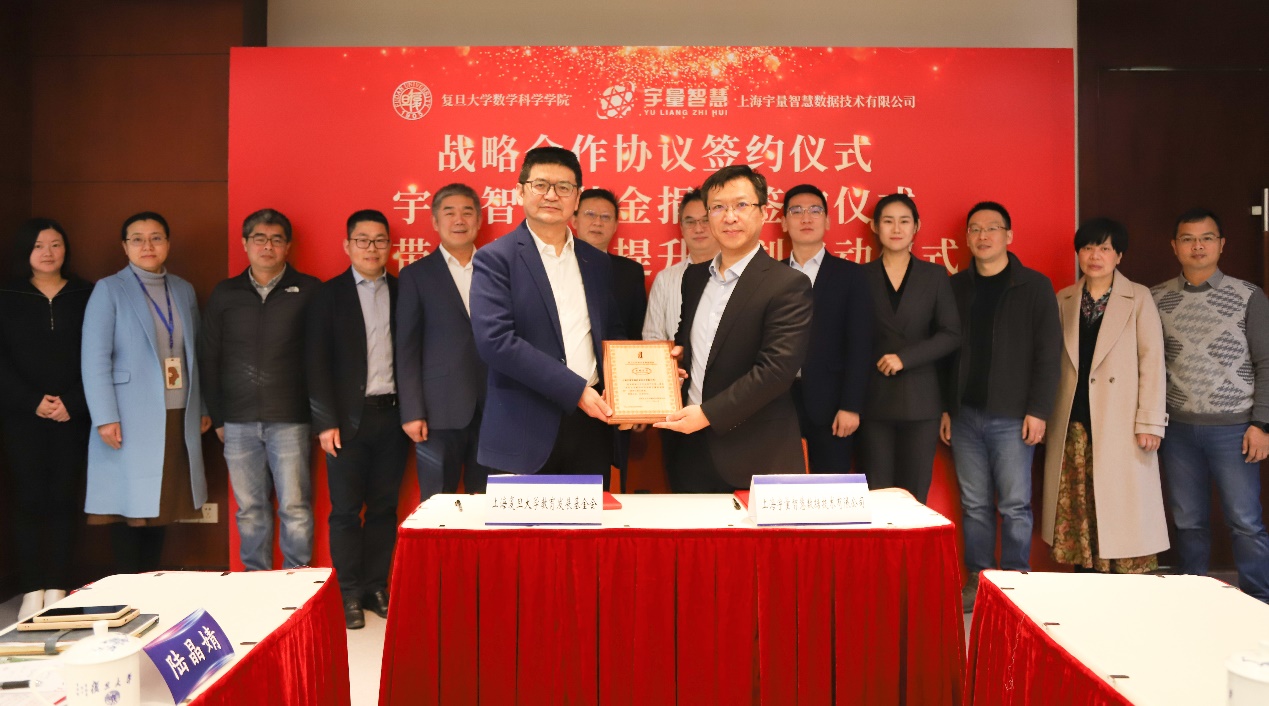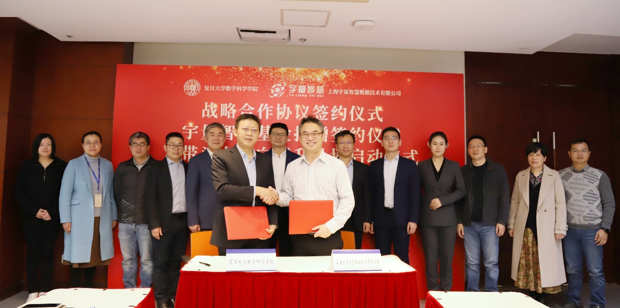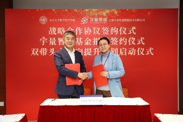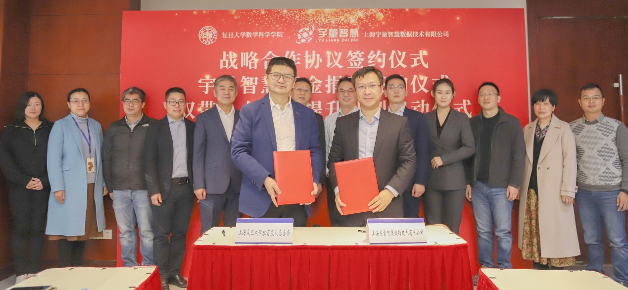 1月7日上午,复旦大学数学科学学院与上海宇量智慧数据有限公司战略合作协议签订仪式暨数学科学学院宇量智慧基金捐赠签约仪式、复旦大学数学科学学院双带头人双向提升计划启动仪式在光华楼东主楼2201隆重举行。上海宇量智慧数据技术有限公司总裁李江城、副总裁赵波、人事总监潘淼、销售总监高雪松,对外联络与发展处处长、上海复旦大学教育发展基金会秘书长杨增国,数学科学学院党政班子成员和教师代表出席。数学科学学院党委副书记刘建峰主持仪式。