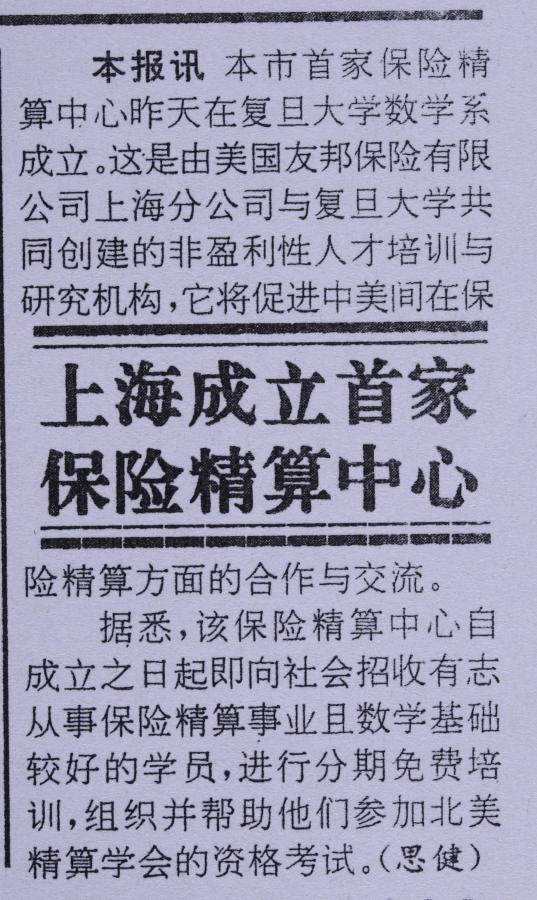 精算是保险和社会保障领域的关键核心技术,对于推动保险业长期稳健发展,保障国家金融安全至关重要。1992年,友邦回到上海开展业务,亟需精算人才。与此同时,复旦大学数学系一直深入探索扩大数学的应用领域,在应用数学专业中开设精算学研究方向。1994年,在双方的大力推动下,友邦-复旦精算中心应运而生,并成为高校与企业合作的典范。