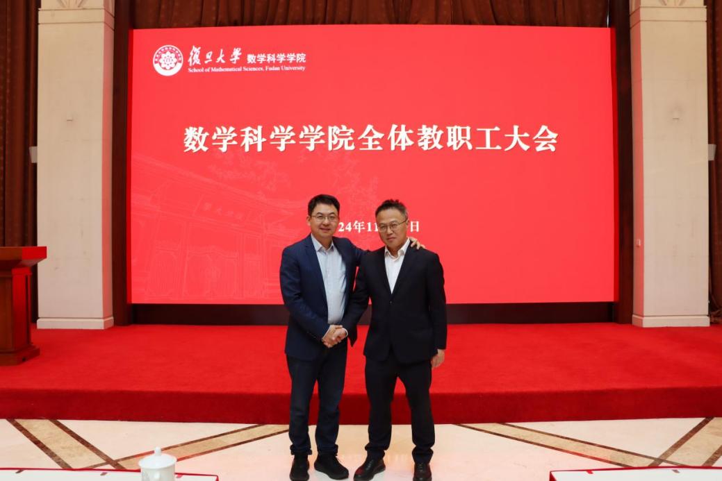 艾竹部长宣读了任免决定:沈维孝任复旦大学数学科学学院院长,雷震因调任学校发展规划处处长,不再担任数学科学学院院长。