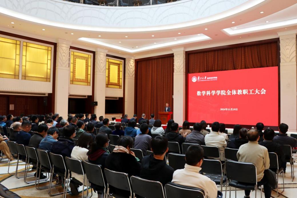 11月19日下午,复旦大学数学科学学院召开全体教职工大会,宣布学校党委关于数学科学学院院长的任免决定。复旦大学副校长周磊出席会议并讲话,校党委常委、组织部部长艾竹出席会议并宣布决定。校党委委员、数学科学学院党委书记王光临主持会议。