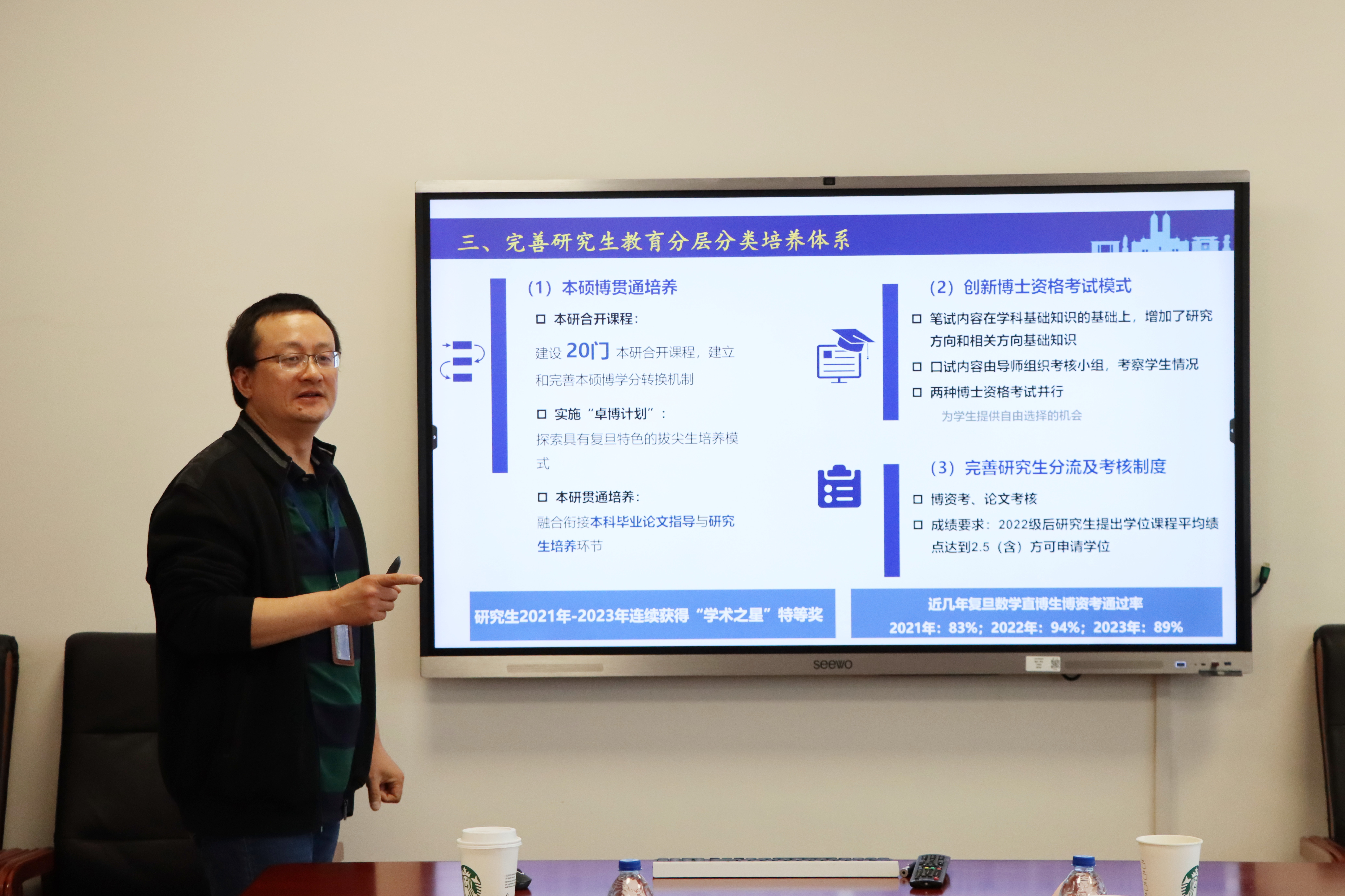 数学科学学院副院长陆帅主要从招生改革举措、培养举措两个方面详细介绍了数学学科研究生培养情况,指出学科高水平建设高层次人才中心,推进培养体系、课程体系等方面多项改革举措,不断深化研究生拔尖创新人才培养力度。