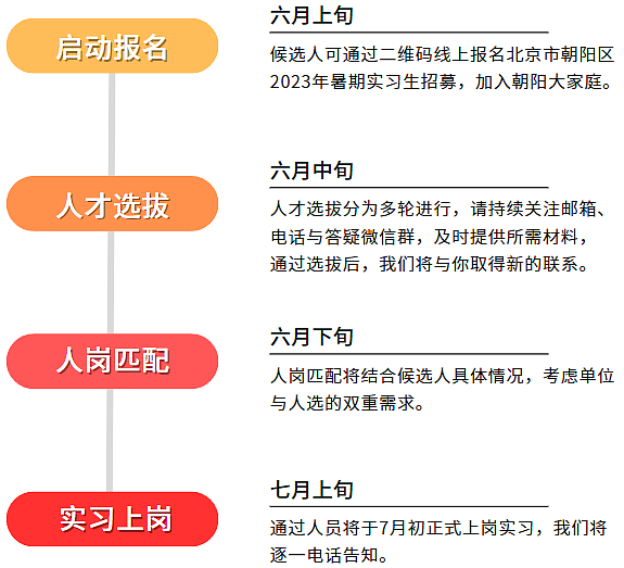 为吸引更多优秀高校毕业生报考2024年度朝阳区定向选调及京考岗位,鼓励学子提前走进朝阳、了解朝阳,最终加入朝阳大家庭,特开展2023年暑期实习工作,公开招募实习生。