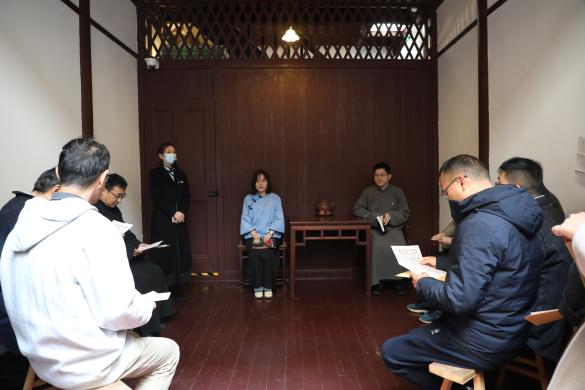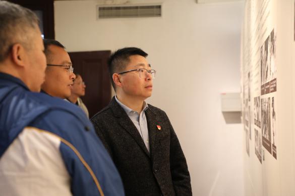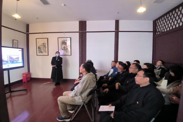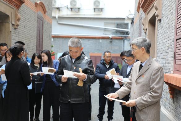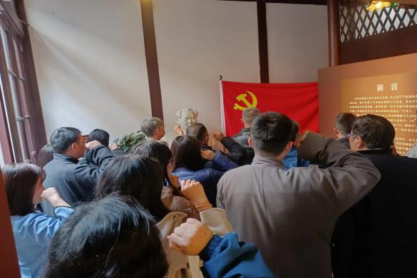 学院党委一行在集中佩戴党员徽章的仪式中开始了本次学习,仔细聆听甲秀里的故事,认真学习《毛泽东与静安》《一张全家福》党课,随后在陈列馆现场观摩体验了情景党课《印迹·青色梦想》。