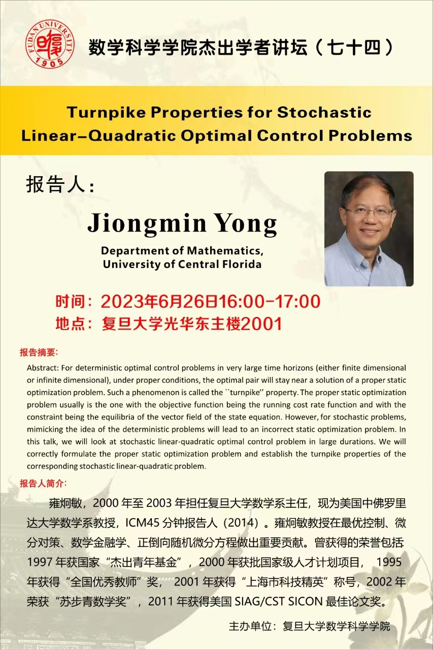 For deterministic optimal control problems in very large time horizons (either finite dimensional or infinite dimensional), under proper conditions, the optimal pair will stay near a solution of a proper static optimization problem. Such a phenomenon is called the ``turnpike’’ property. The proper static optimization problem usually is the one with the objective function being the running cost rate function and with the constraint being the equilibria of the vector field of the state equation. However, for stochastic problems, mimicking the idea of the deterministic problems will lead to an incorrect static optimization problem. In this talk, we will look at stochastic linear-quadratic optimal control problem in large durations. We will correctly formulate the proper static optimization problem and establish the turnpike properties of the corresponding stochastic linear-quadratic problem.