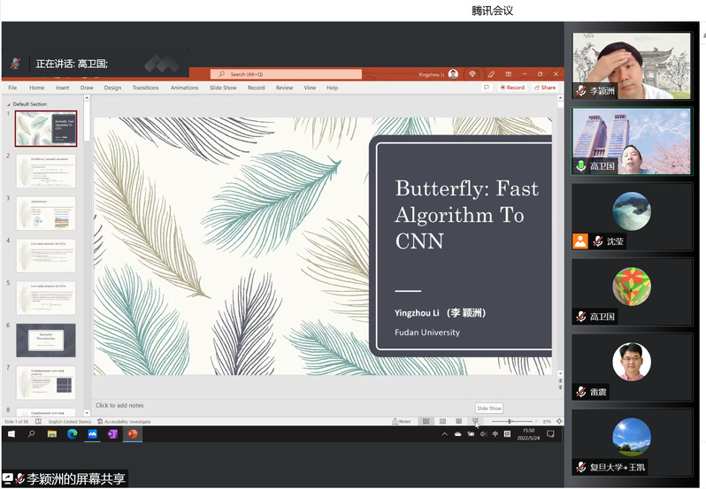 2022年5月24日(星期二)下午,数学科学学院以腾讯会议线上形式召开了2022年校庆报告会暨2022年非线性数学模型与方法教育部重点实验室学术年会。首先陈猛教授做了题为“高维代数簇的精细分类问题:现状及展望”的精彩报告。然后,张国华教授、李颖洲青年研究员分别作了题为“New dynamical characterization of countable amenable groups”“From fast algorithm to neural network: Butterfly factorization and Butterfly-Net”的学术报告,介绍了最新的学术进展。