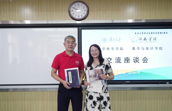 座谈会上,河西学院数学与统计学院党政负责人介绍了学院主题教育、党的建设、思政育人、学科专业、师资队伍、人才培养、专业认证、教学科研等基本情况、育人特色和学院发展瓶颈。学院党委书记王光临从学科建设、师资队伍、科学研究、人才培养、党建领航等方面介绍了复旦大学数学学科在向世界一流学科迈进过程中取得的育人成果,并代表学院向河西数学与统计学院赠送了《苏步青业余诗词抄》等书籍。双方教师围绕硕士研究生培养、师资队伍培养进行了深入探讨,表示今后将在青年教师培养、科研团队建设等方面加强合作和联系,充分发挥复旦大学数学学科优势和河西学院数学学科优良特点,为河西学院数学科学发展提供坚定支持。