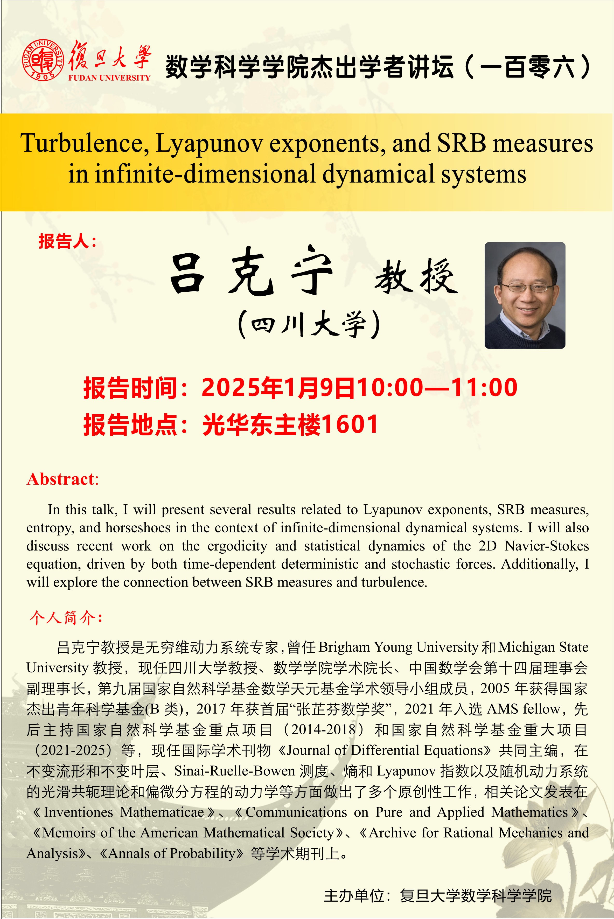 In this talk, I will present several results related to Lyapunov exponents, SRB measures, entropy, and horseshoes in the context of infinite-dimensional dynamical systems. I will also discuss recent work on the ergodicity and statistical dynamics of the 2D Navier-Stokes equation, driven by both time-dependent deterministic and stochastic forces. Additionally, I will explore the connection between SRB measures and turbulence.