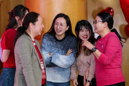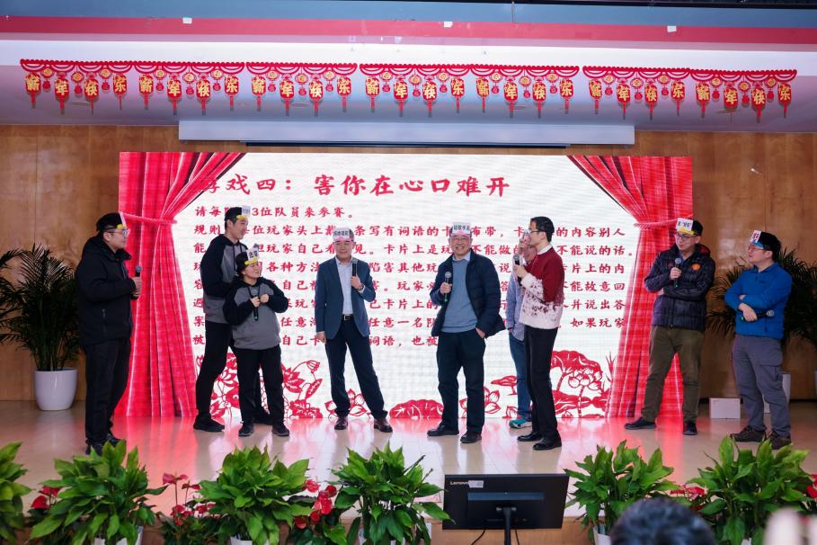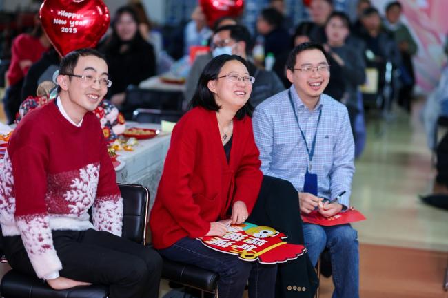 在游戏环节,师生们分成四组就坐,分别有瑞蛇送安、金蛇迎春、灵蛇纳福、祥蛇贺岁四支战队,在第一个游戏新年团团抱中,大家拥抱彼此,迎来了本次茶话会的小高潮。