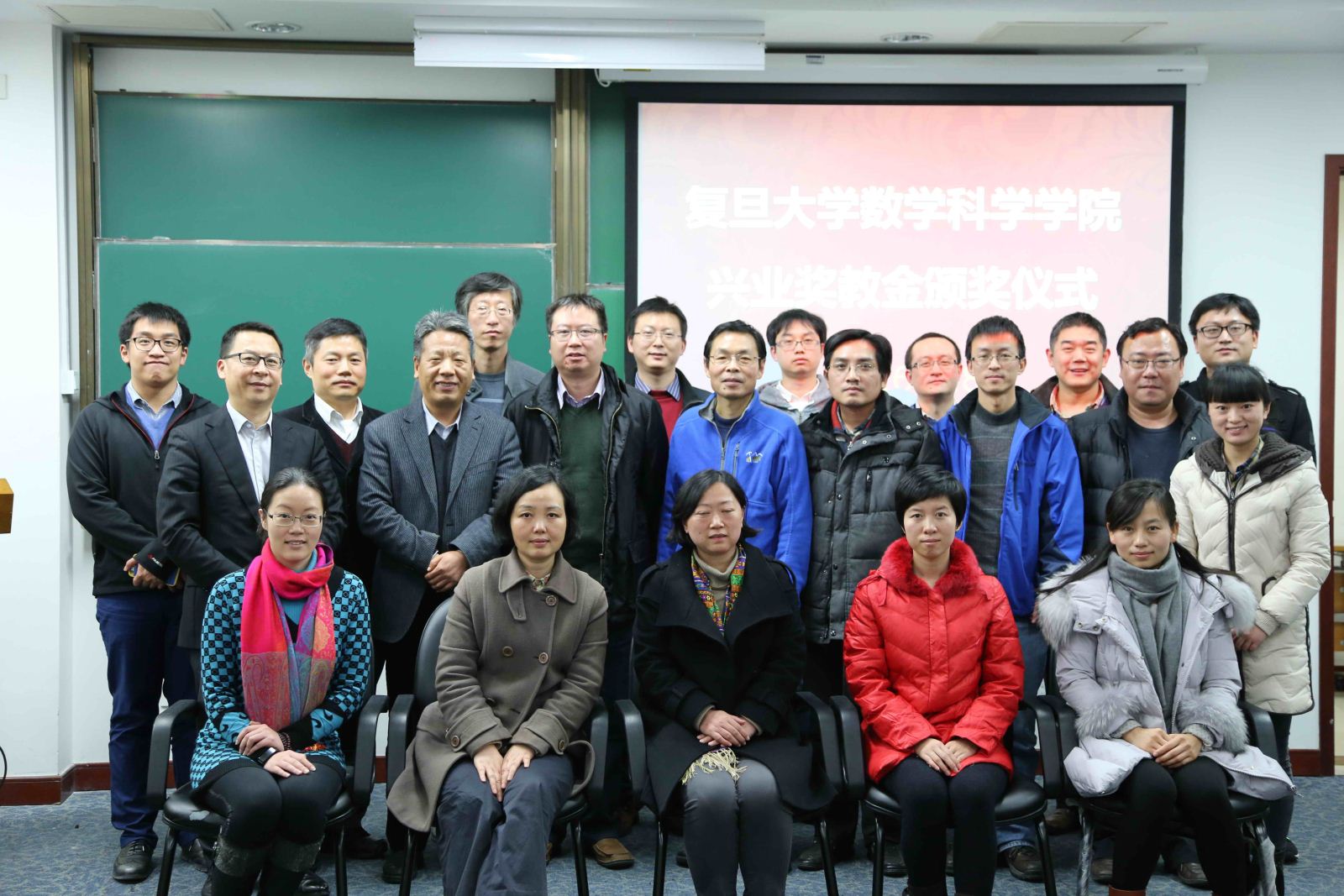2016年1月8日下午,复旦大学数学科学学院“兴业奖教金”颁奖仪式在光华楼东主楼1501室举行。兴业全球基金管理有限公司总经理杨东先生,综合管理部副总监郭隆建先生,负责公益慈善项目的陆申旸先生,复旦大学对外联络与发展处章晓野副处长、陈超怡老师,学院获奖教师出席颁奖仪式。