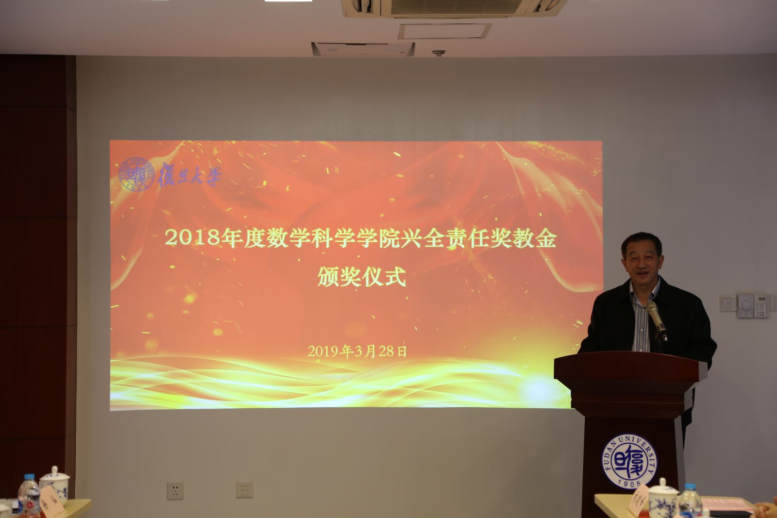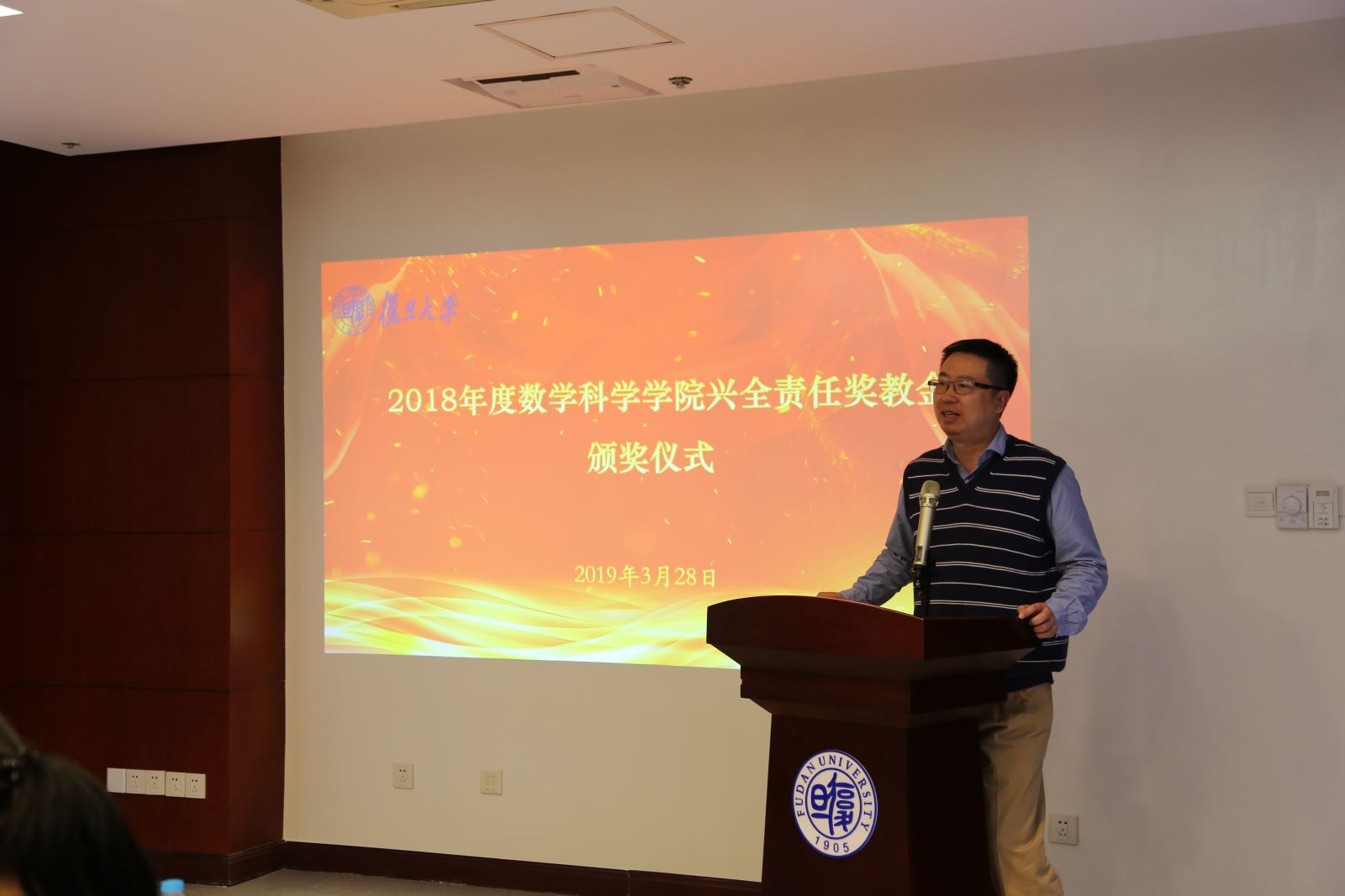 复旦大学数学科学学院兴全责任奖教金由兴全基金管理有限公司以及杨东、杜昌勇两位校友捐赠设立,用于奖励数学科学学院教学有方、广受好评,潜心科研,取得优秀科研成果以及热心学院公共服务工作的老师。根据评选办法,共有11位教职工荣获2018年度兴全责任奖教金。