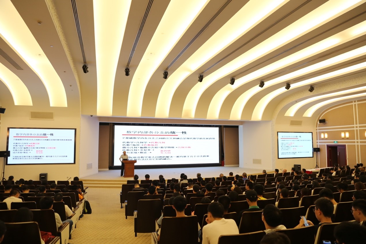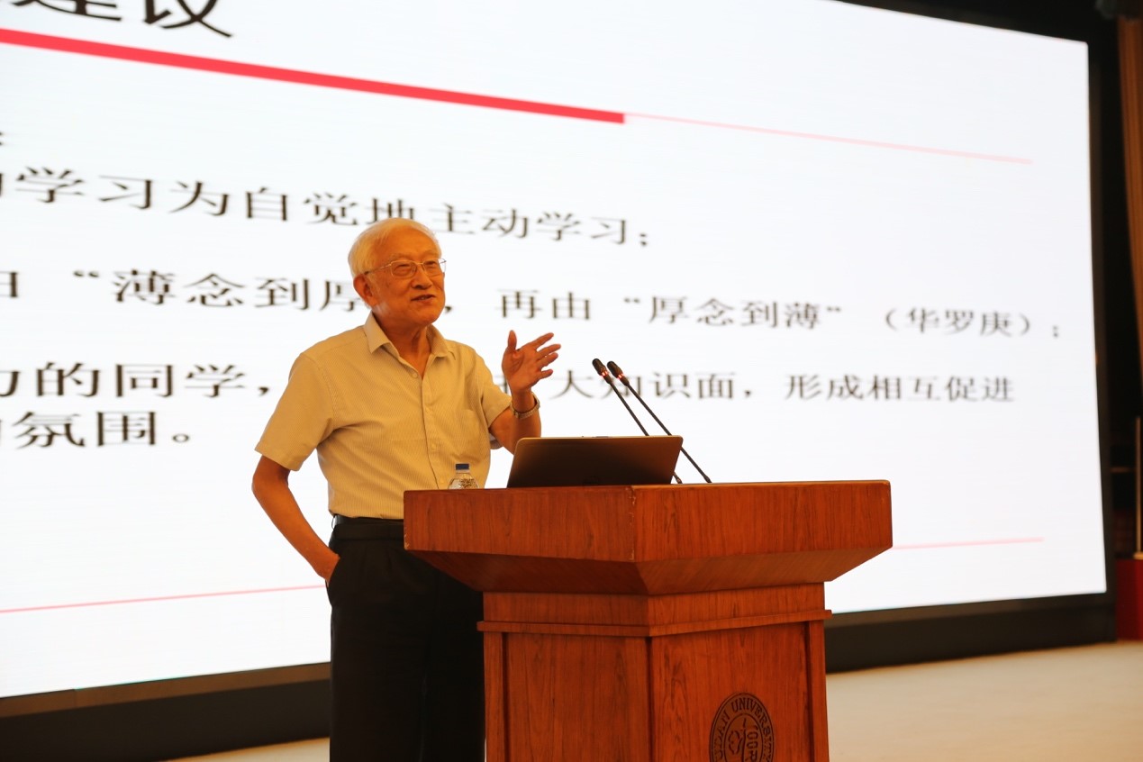 在热烈的掌声中,洪家兴院士给同学们带来了“开学第一课”,他满怀深情地介绍了复旦数学的历史沿革、人才培养、科学研究和育人成果,并结合当代科学和经济发展,深入浅出地阐述了数学科学体系对各个门类学科的贡献,鼓励同学们坚持对数学的热爱,一步一个脚印,打下扎实的基础,树立高远的志向,敢于探索重大问题,并要始终像老一辈数学家一样保持谦虚。