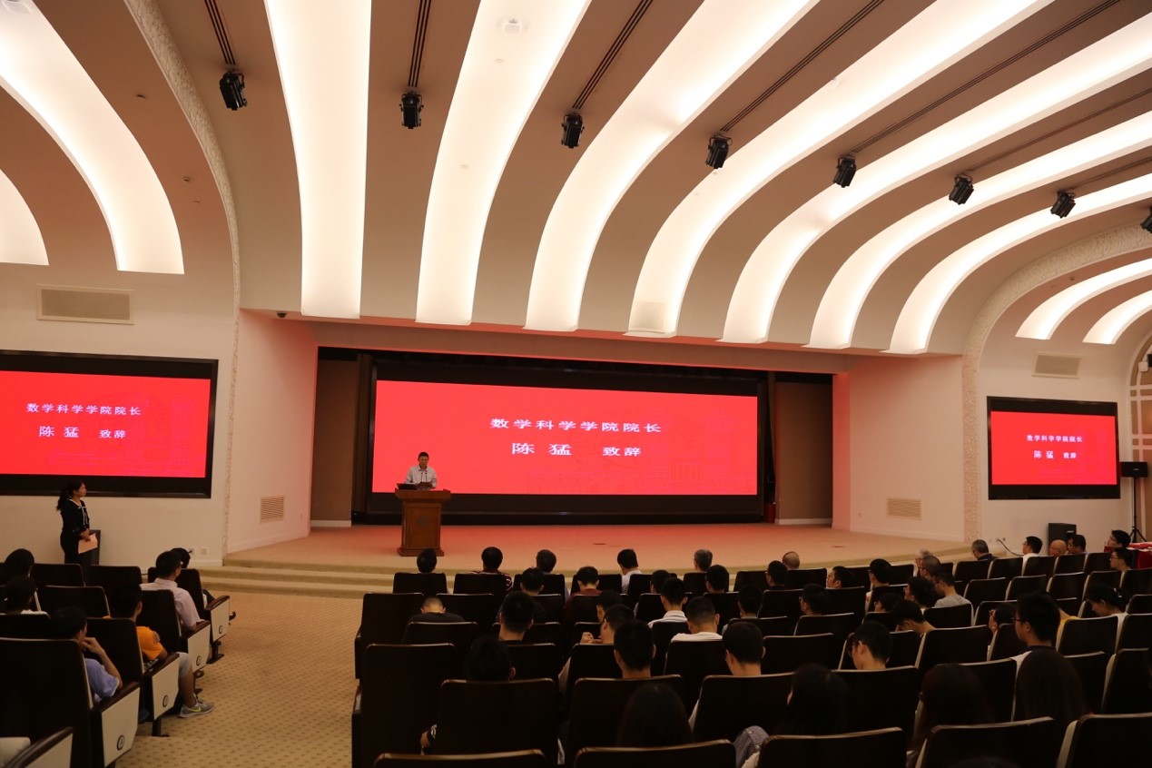 数学科学学院院长陈猛对新生们的到来表示热烈的欢迎,他向同学们介绍了学院历史发展、学术影响力及师资队伍,鼓励大家刻苦学习、坚持不懈,努力实现自己的理想,在复旦数院收获丰富多彩的学习生活。