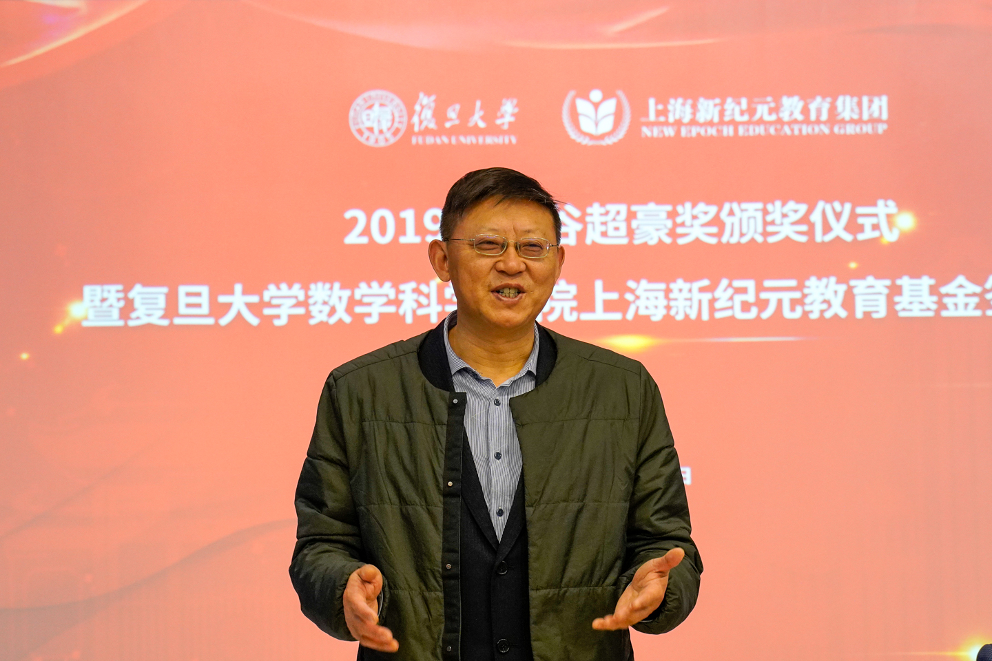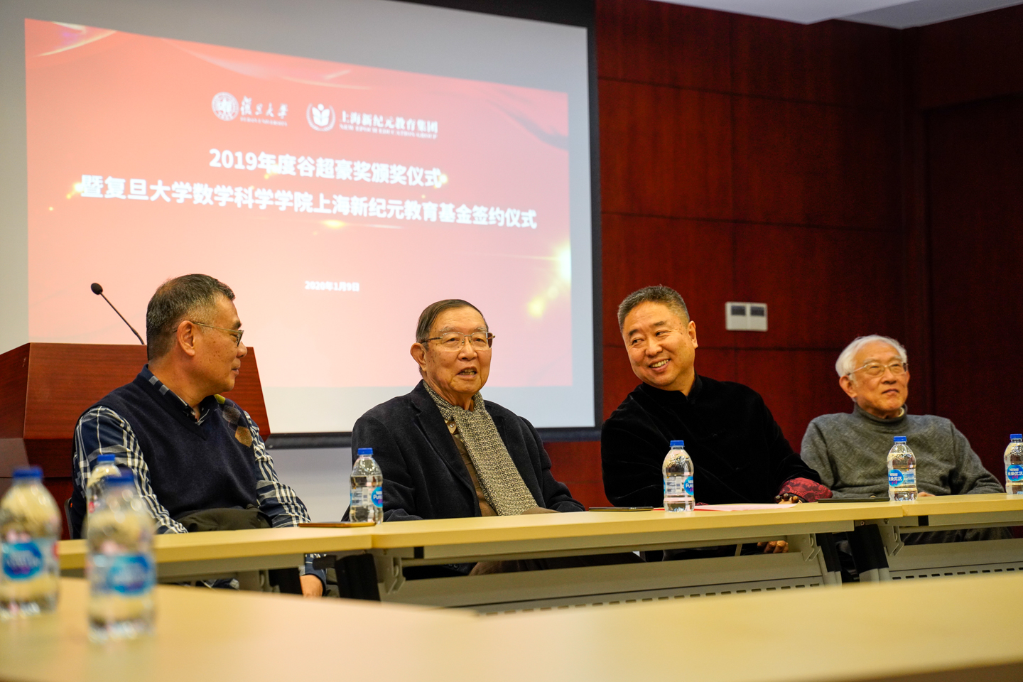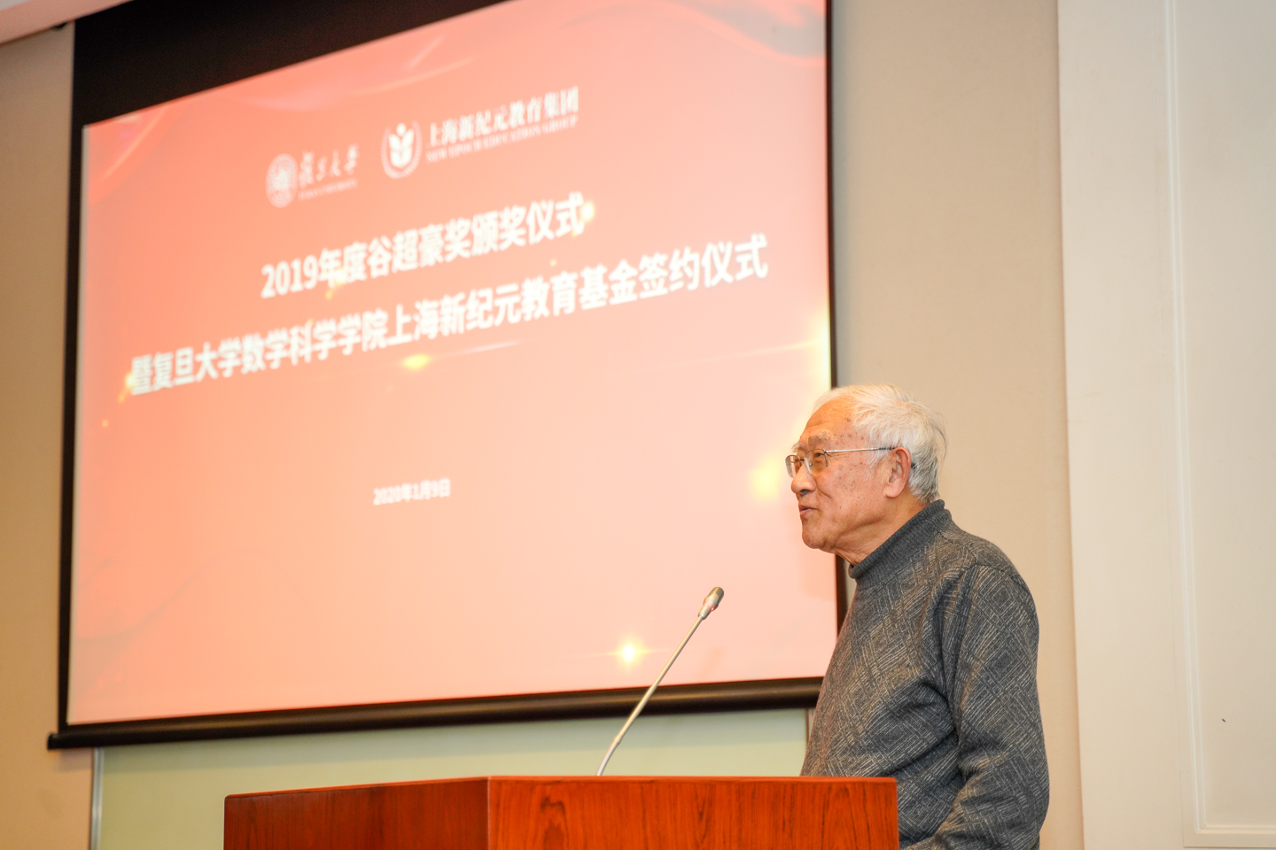 为纪念谷超豪先生对数学事业的杰出贡献,并激励复旦大学中、青年数学工作者努力做出具有创造性的研究工作,2013年复旦大学设立“谷超豪奖”。洪家兴院士宣读2019年度“谷超豪奖”获奖名单并介绍了两位获奖者的学术成就。常务副校长金力为获奖者颁奖并致辞,金力院士在致辞中指出谷超豪先生始终将国家、社会的需要看作科学研究的生命所在,笃志向学,不懈攀登;始终坚守在教书育人的第一线,潜心育人,甘为人梯,把毕生心血都献给了国家的教育事业和科学事业。他强调要继续传承和弘扬谷超豪先生“心有大我、至诚报国”的崇高品格和“严谨务实、勇攀高峰”的治学精神,以此营造崇德尚学、敬业育人的良好风尚,并向上海新纪元教育集团对复旦大学数学学科的支持表达诚挚感谢。