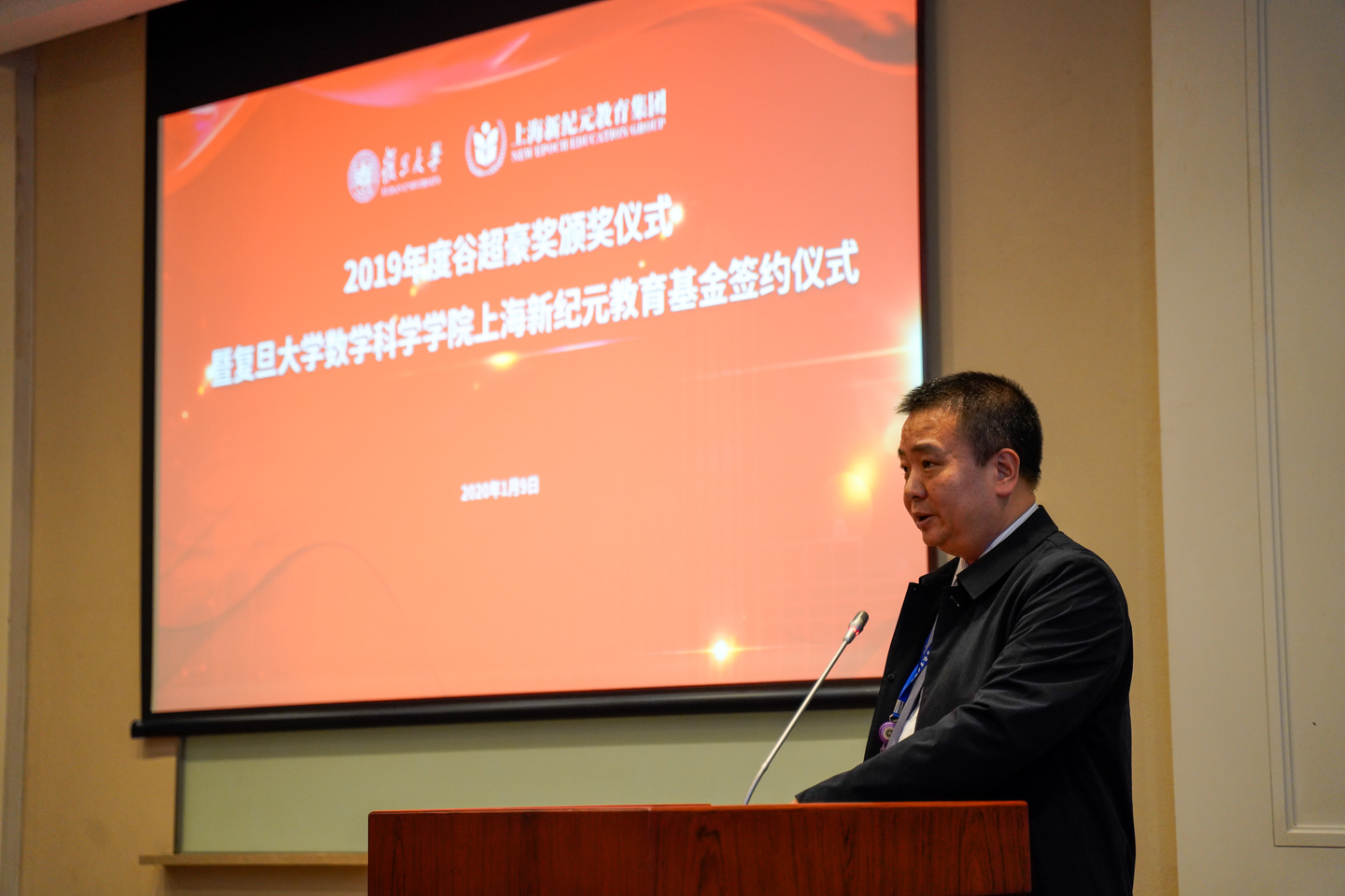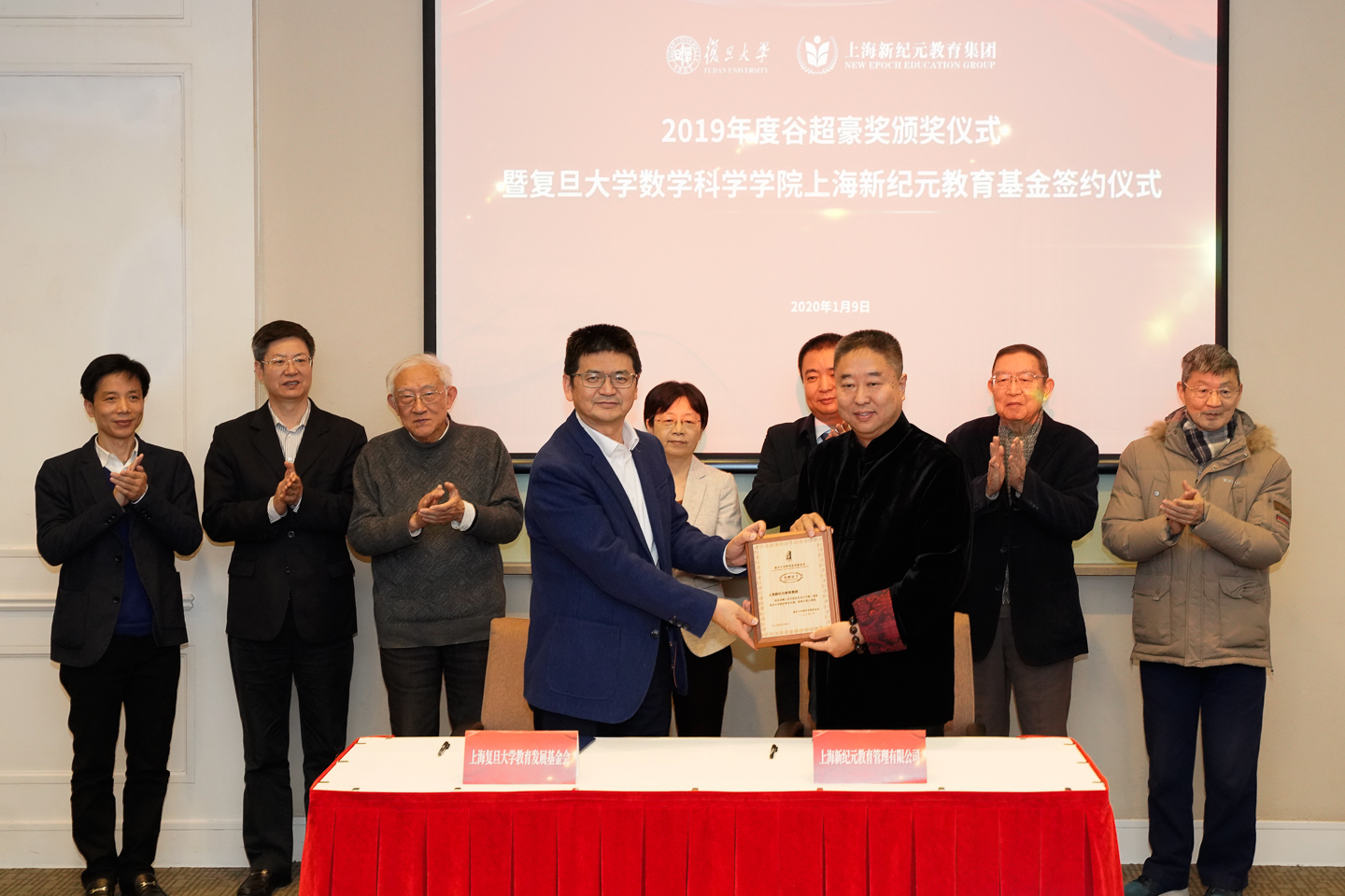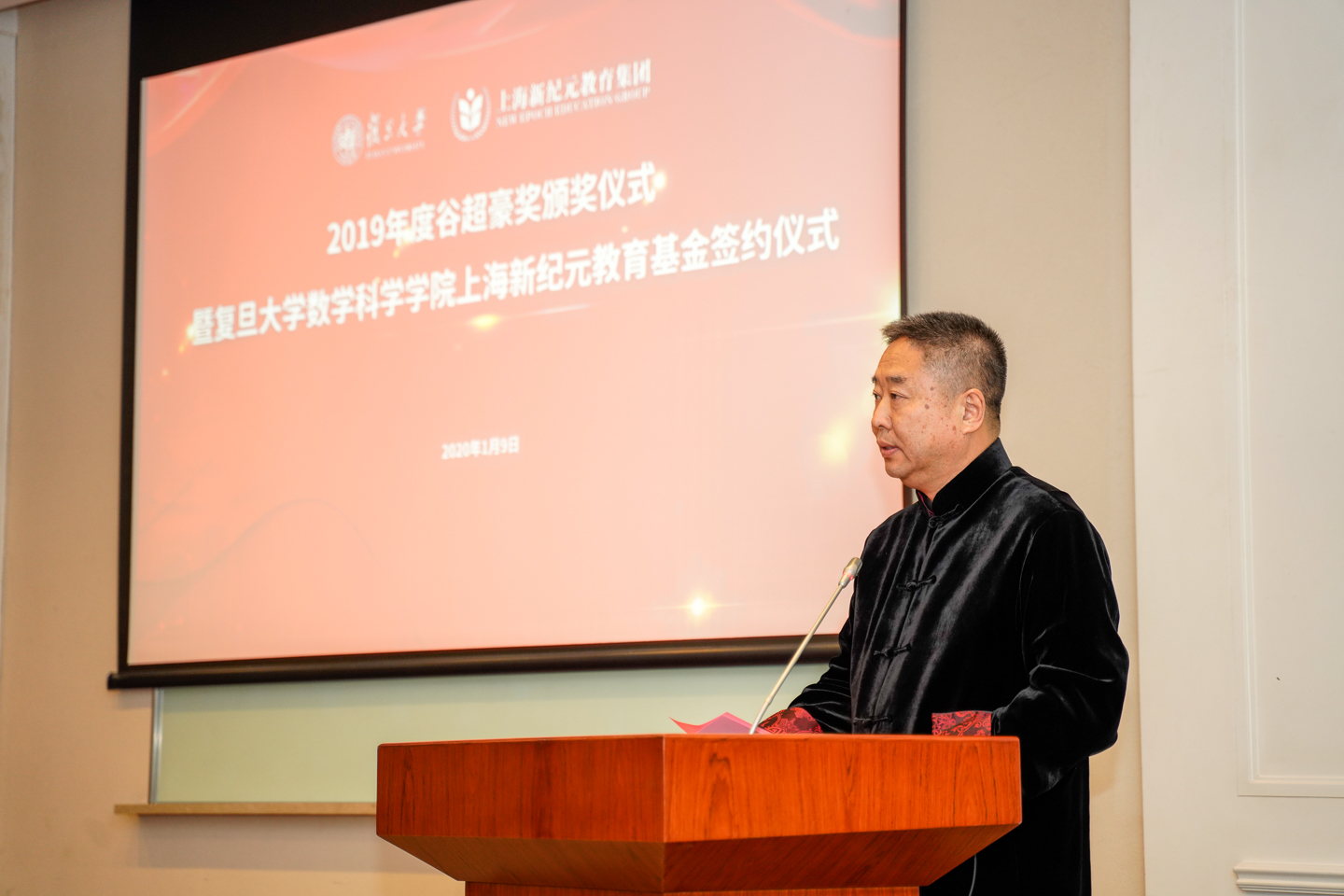 为纪念谷超豪先生对数学事业的杰出贡献,并激励复旦大学中、青年数学工作者努力做出具有创造性的研究工作,2013年复旦大学设立“谷超豪奖”。洪家兴院士宣读2019年度“谷超豪奖”获奖名单并介绍了两位获奖者的学术成就。常务副校长金力为获奖者颁奖并致辞,金力院士在致辞中指出谷超豪先生始终将国家、社会的需要看作科学研究的生命所在,笃志向学,不懈攀登;始终坚守在教书育人的第一线,潜心育人,甘为人梯,把毕生心血都献给了国家的教育事业和科学事业。他强调要继续传承和弘扬谷超豪先生“心有大我、至诚报国”的崇高品格和“严谨务实、勇攀高峰”的治学精神,以此营造崇德尚学、敬业育人的良好风尚,并向上海新纪元教育集团对复旦大学数学学科的支持表达诚挚感谢。