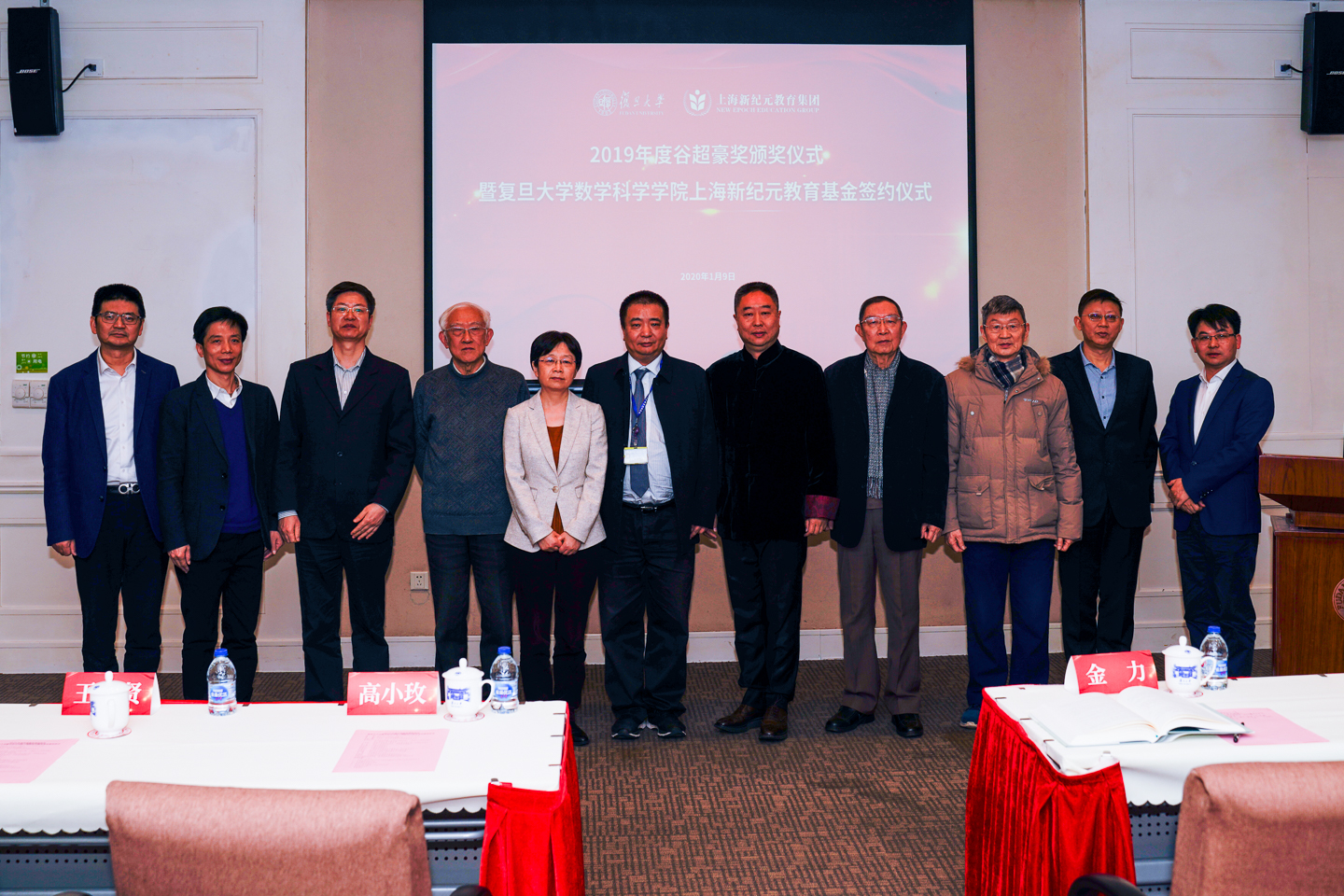 1月9日下午,2019年度谷超豪奖颁奖仪式暨“复旦大学数学科学学院上海新纪元教育基金”签约仪式在光华楼东辅楼101室举行。全国政协常委、民革中央副主席、上海市人大常委会副主任、民革上海市委主委高小玫,民革中央委员、民革上海市委会副主委、全国政协委员、上海市政协常委王光贤,复旦大学常务副校长金力,中国科学院院士李大潜、洪家兴、陈恕行,上海新纪元教育集团董事长陈伟志,浙江省人民政府驻上海办事处副主任章春华,温州市政府驻上海联络处徐珅隆,复旦大学对外联络与发展处杨增国处长、章晓野副处长,历届“谷超豪奖”获奖者,复旦大学数学科学学院党政领导班子成员、教师及学生代表出席参加活动。数学科学学院党委书记王永珍主持活动。