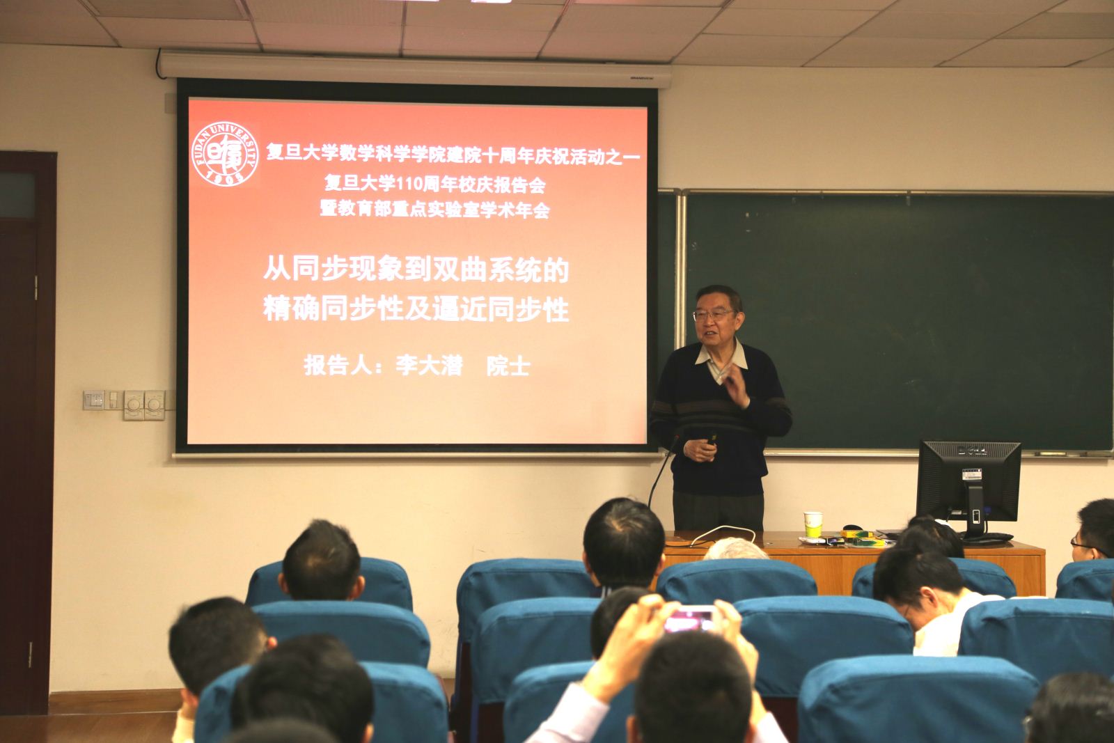 2015年5月26日下午,数学科学学院师生挤满2001室隆重举行复旦大学建校110周年及数学科学学院建院十周年学术活动暨教育部重点实验室2015学术年会。李大潜院士以“从同步现象到双曲系统的精确同步性及逼近同步性”为题介绍了近年来他们在这一课题的研究方面的成果和展望,其精彩生动的学术报告使听众深受鼓舞并将整个学术活动推向高潮。在第二阶段的学术报告会上,星空网页版登录入口三位青年教师石磊副教授、许亚善副教授和田学廷副教授先后登台亮相,他们展示了数学科学学院的青年教师风采。祝贺今年的校庆报告会取得成功!