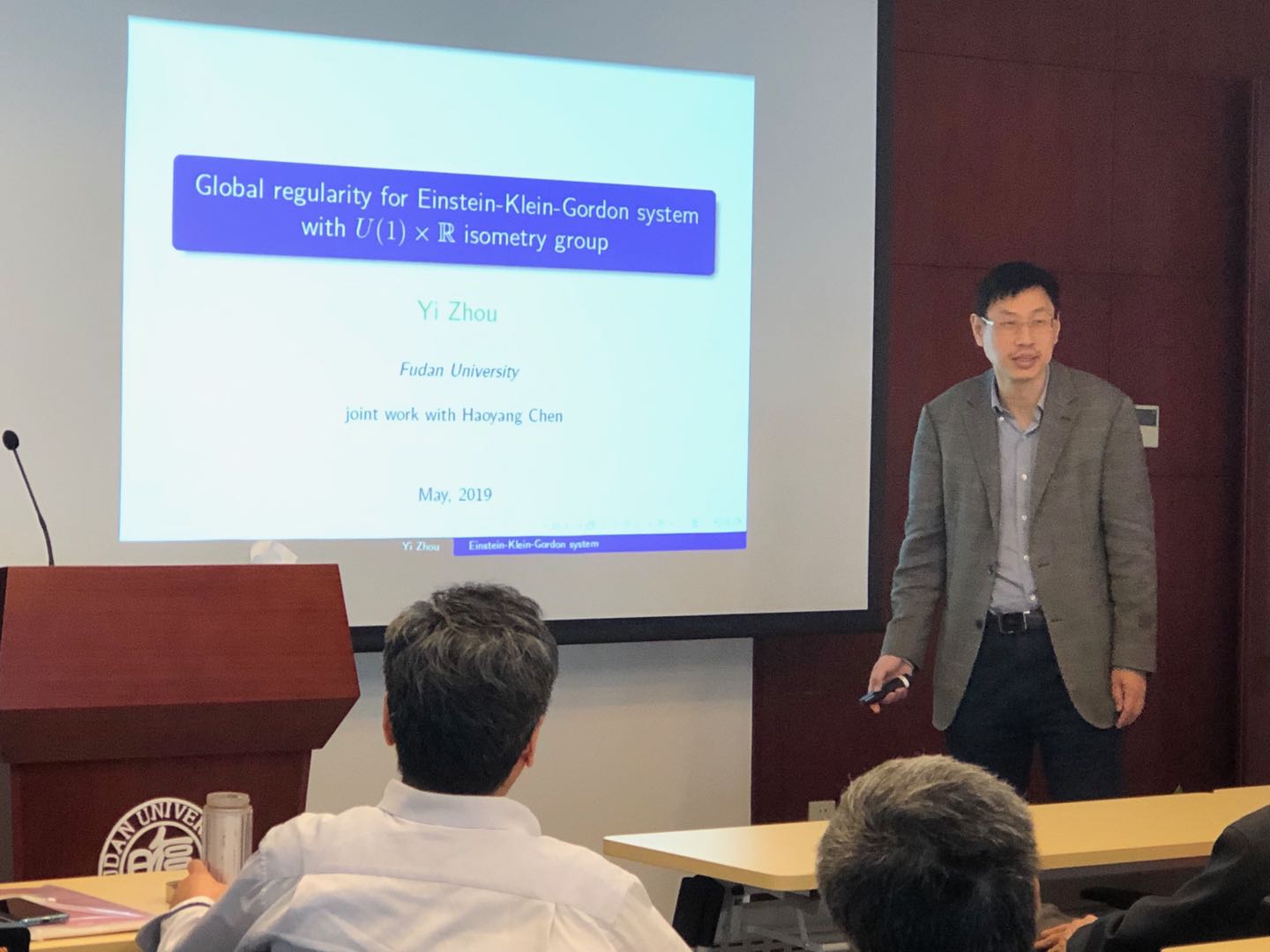 2019年5月21日(星期二)下午,数学科学学院在复旦大学光华东主楼2201室召开了2019年校庆报告会暨非线性数学模型与方法教育部重点实验室学术年会。首先周忆教授做了题为“Global regularity for Einstein-Klein Gordon system with U(1)× R isometry group”的报告。然后,青年教师张仑副研究员、谢纳庆教授先后做了学术报告,介绍了他们最新的科研进展。