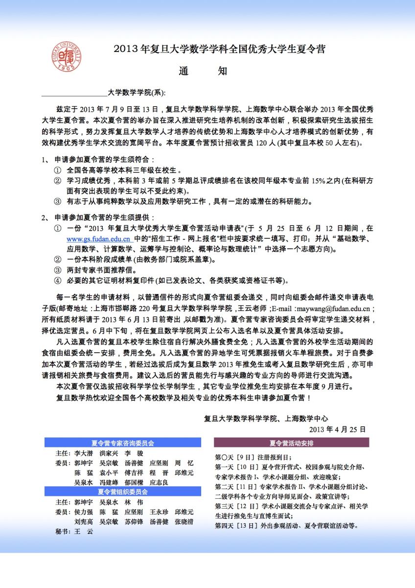 2013年复旦大学数学学科全国优秀本科生夏令营活动通知