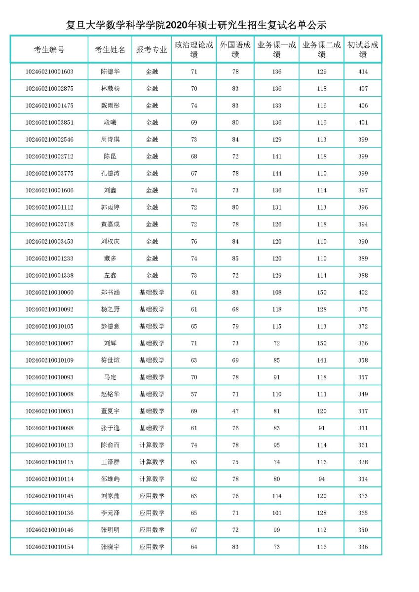 复旦大学数学科学学院2020年公开招考硕士研究生复试名单