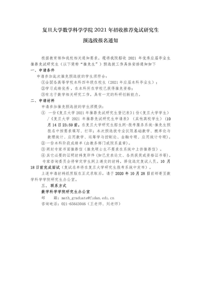 2021年复旦大学数学科学学院研究生推免预选拔通知