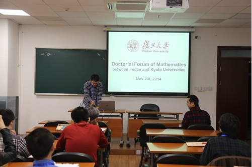 “复旦—京都中日博士生数学论坛”于2014年11月2日至8日在复旦大学数学科学学院顺利举行。来自复旦大学数学学院和日本京都大学数学系的部分博士生和教师参加了此次学术活动。在论坛的开幕上,学院院长郭坤宇教授发表了热情洋溢的欢迎致辞——他对日本师生的来访交流表示热烈的欢迎,并衷心希望两校数学博士生能通过本次论坛加强学术交流、提升学术创新能力和增进友谊。本届论坛的具体学术组织工作全程由学院博士生完成,活动的举办也获得了校研究生院、数学学院以及相关部门老师的大力支持、帮助和指导。
