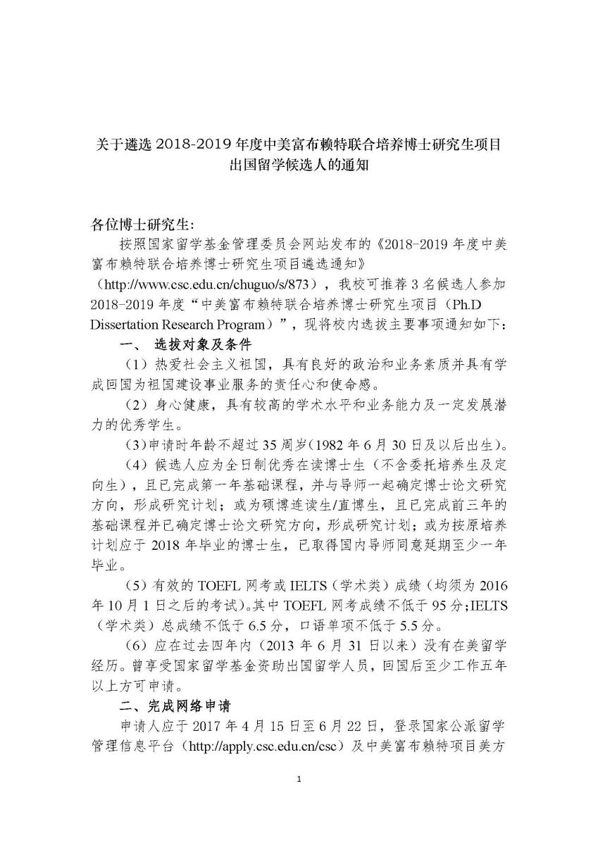 关于遴选2018-2019年度中美富布赖特联合培养博士生项目出国留学候选人的通知