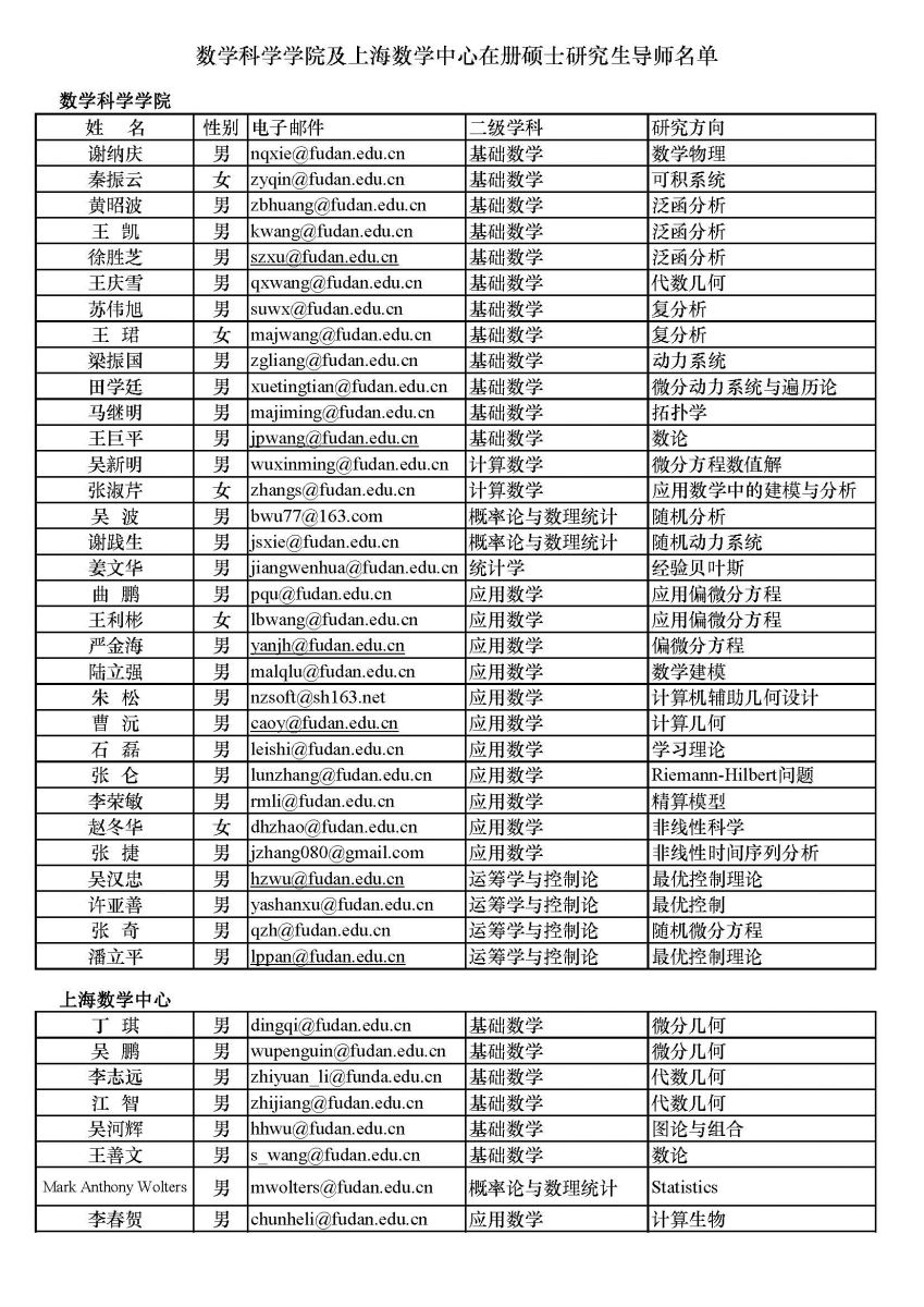 2017年数学科学学院及上海数学中心在册硕士研究生导师名单