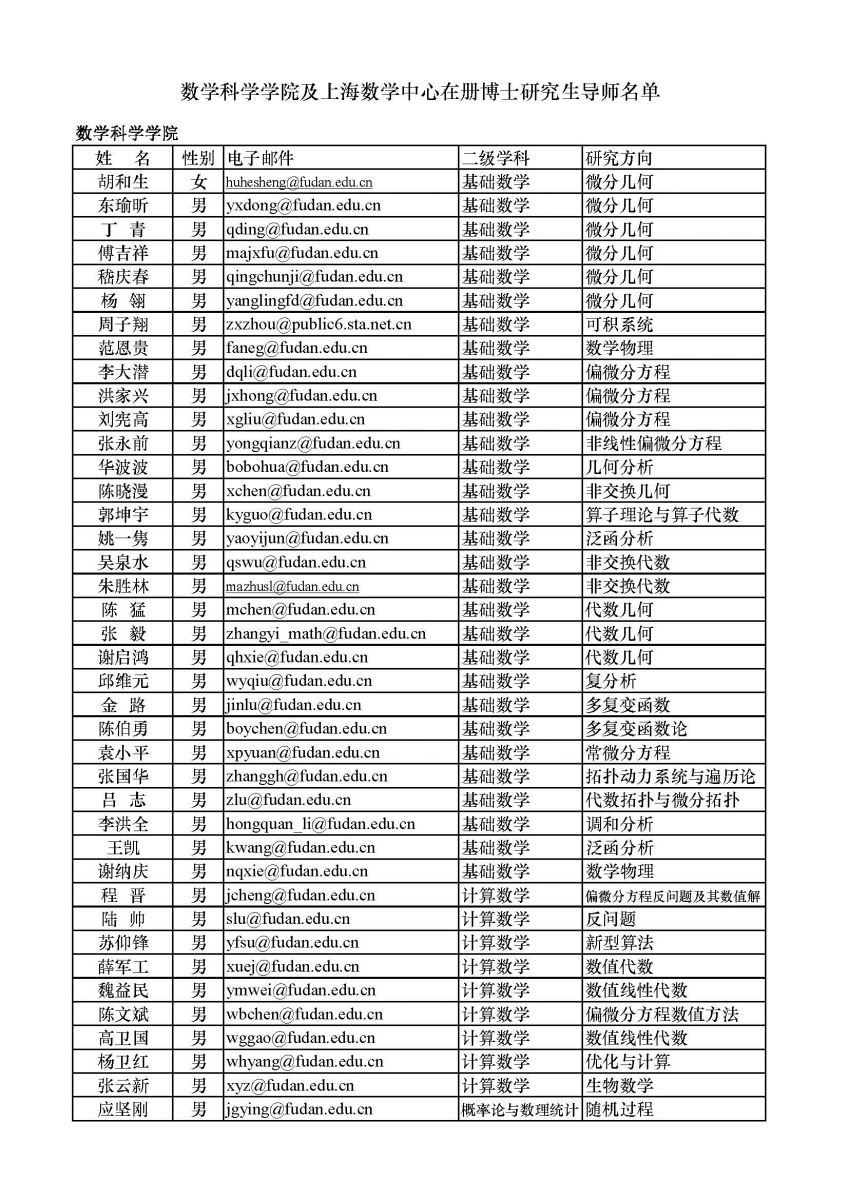 2018年数学科学学院及上海数学中心在册博士研究生导师名单
