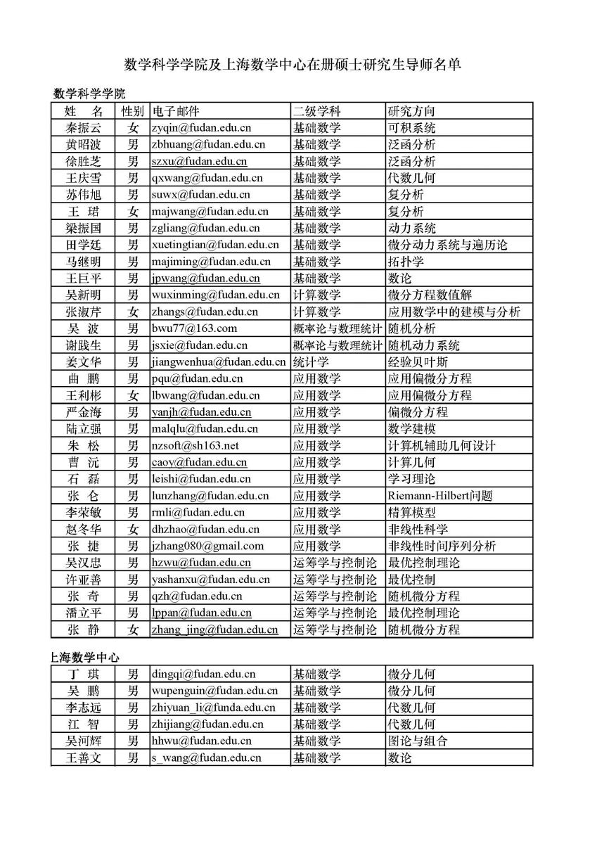 2018年数学科学学院及上海数学中心在册硕士研究生导师名单