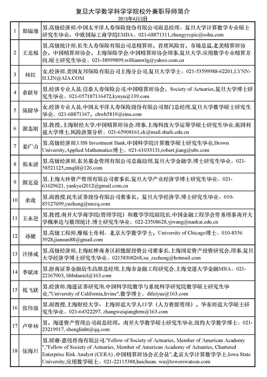 复旦大学数学科学学院校外兼职导师简介