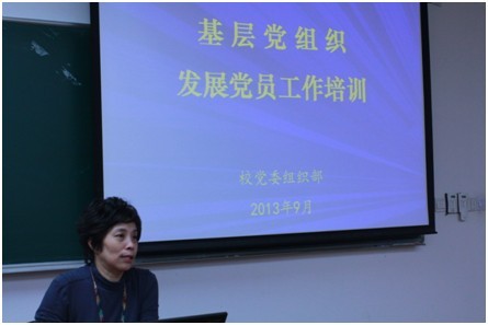 仇棣老师首先对当前党建工作的新形势做了介绍,她阐述了十八大报告中提出的党建工作的新要求,进一步服务群众、进一步健全党的基层组织体系,增强党员党性、提高党员素质,加强和改进党员队伍教育管理是当前党建工作的重点,并对“控制总量、优化结构、提高质量、发挥作用”的十六字总方针作了解读。随后,她就发展党员工作的流程和职责进行了详细的说明,从制定发展计划到发展党员,再到预备党员转正,每一个阶段都有明确的要求和规定,各级党组织具有不同的职责,要理顺关系,权责分明。培训中,仇老师还就实际工作中的具体案例进行了举例分析,让学生党员骨干有更直观的理解。最后,仇棣老师特别强调党支部书记的工作职责,“组织工作无小事”,要求支部书记对党员发展工作必须加以重视,亲力亲为,防止出现失误和差错。