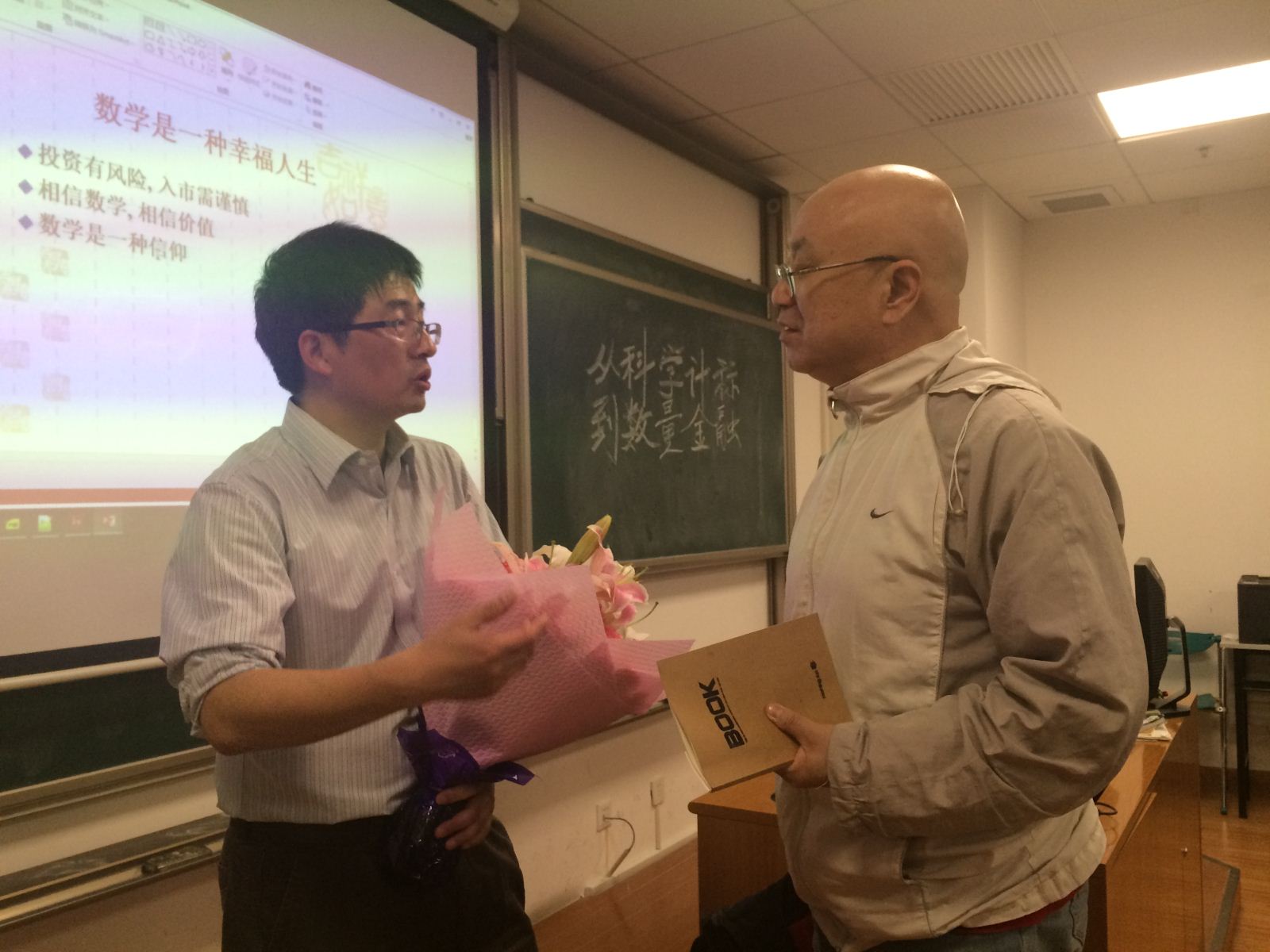 讲座以陈老师多年来的感悟“数学是一种幸福人生”来结尾,鼓励数学科学学院的学生要利用自己的所学,实现个人价值,同时也为社会创造贡献。在提问环节,现场听众踊跃提问,与陈老师就金融等方面在实际操作中遇到的困难进行了更加深入的探讨。在讲座结束后仍有部分听众走上讲台与陈老师切磋与讨论,整场讲座取得圆满成功。