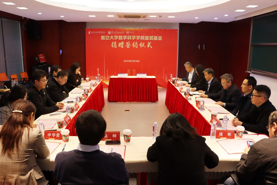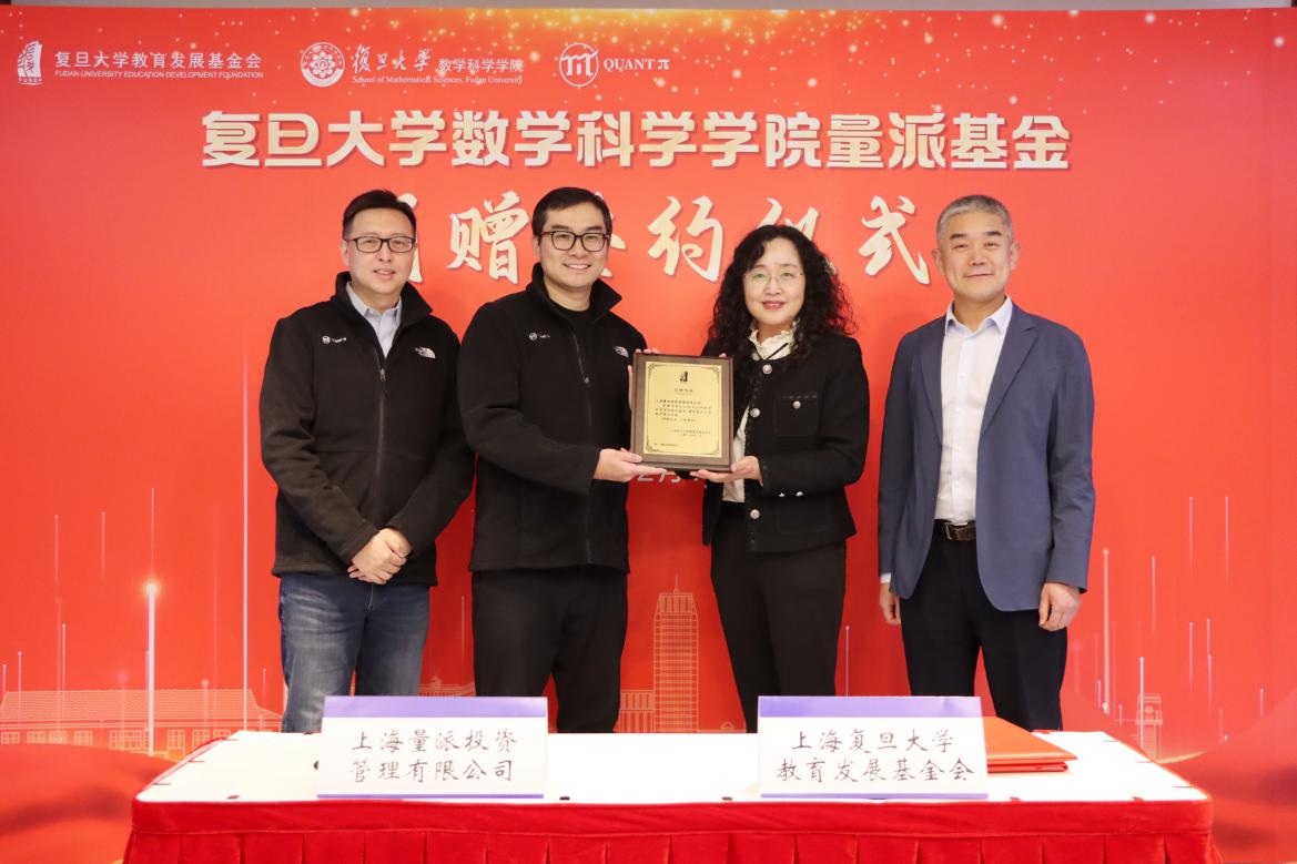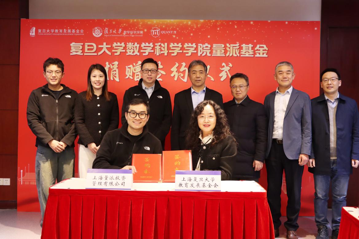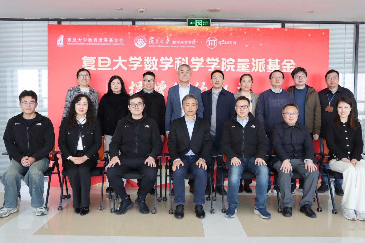 218午,复旦大学数学科学学院量派基金捐赠签约仪式在光华楼东主楼2201会议室隆重举行。上海量派投资管理有限公司创始人、首席执行官孙林,创始人、首席技术官余航,创始人、首席财务官郭彦君,品牌总监赵若帆,中国科学院院士、复旦大学副校长马余刚,对外联络与发展处处长、上海复旦大学教育发展基金会秘书长刘莉,上海复旦大学教育发展基金会项目主管张丹枫,中国科学院院士、数学科学学院院长沈维孝,数学科学学院党政领导班子成员等出席活动。复旦大学党委委员、数学科学学院党委书记王光临主持仪式。