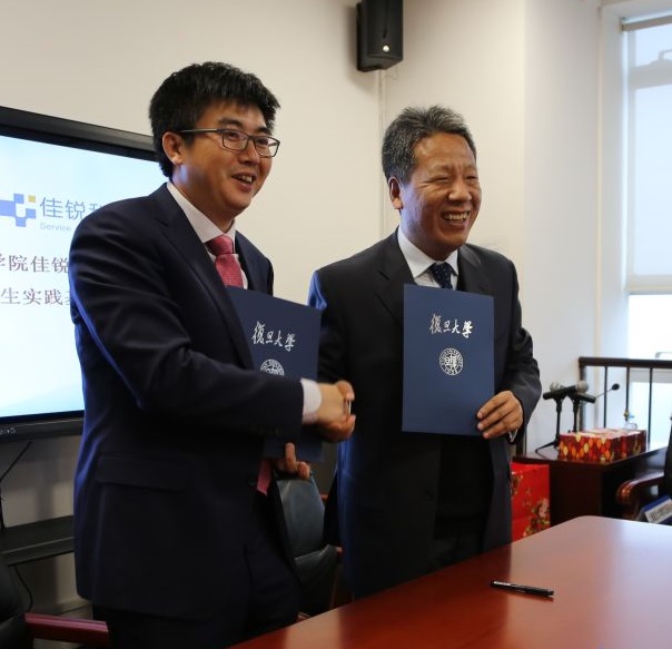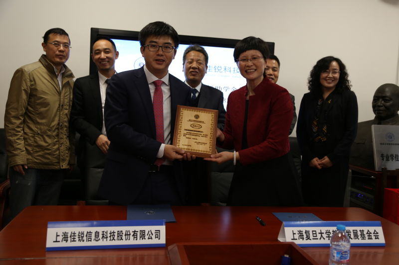 对外联络处处长潘俊在捐赠仪式上致辞,对佳锐科技的慷慨捐赠表示感谢,希望校友们继续关心、支持复旦大学事业的发展,并向杨雪松先生颁发了捐赠牌。2000届校友杨雪松分享了自己重返母校的感受,作为一家创业10年的公司,有机会能回报学校、为师弟师妹们提供实践实习的平台,是佳锐科技的初衷和心愿。双方签订了捐赠协议,佳锐助学金将专门用于资助数学科学学院品学兼优的家庭经济困难学生,每年5万,共四年。受助学生代表向捐赠方表达了感激之情,同时也表示将把这份关爱化为学习成长道路上的动力,争取用实际行动回报学校和社会。数学科学学院院长郭坤宇和佳锐科技董事长杨雪松签署了“专业学位硕士研究生实践基地协议”并授牌,合作共建研究生实践基地,双方将在专业学位研究生培养模式方面进行新的探索和发展。