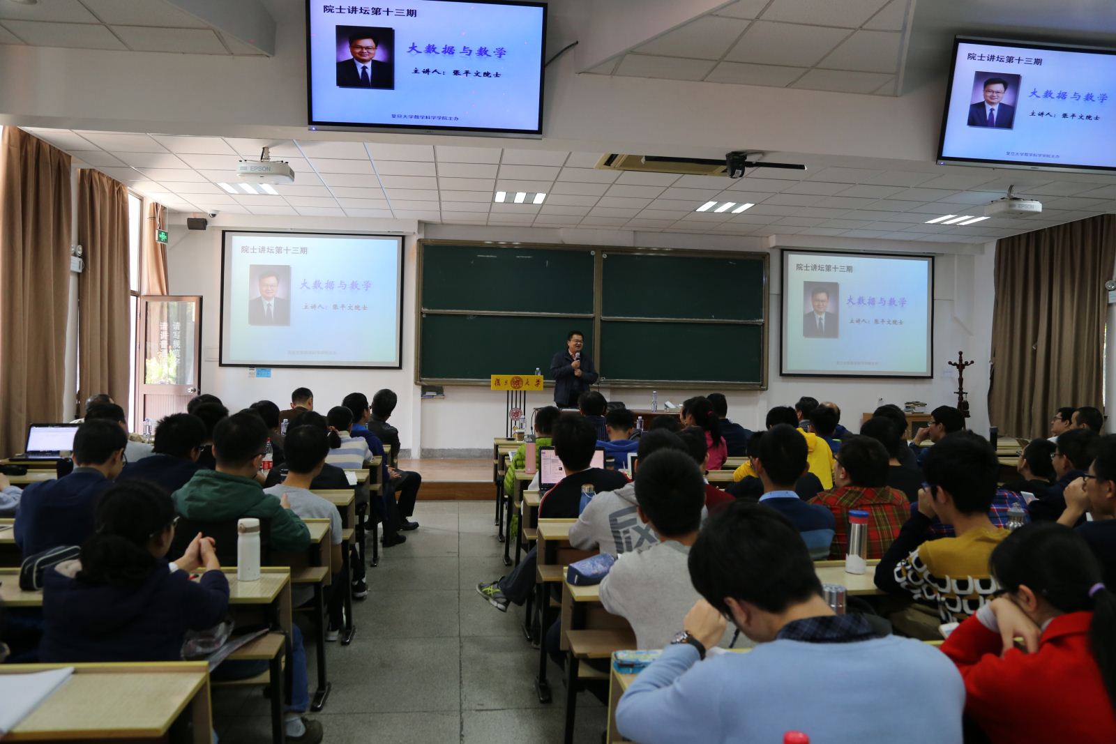 11月4日下午,数学科学学院在第三教学楼3108教室举办第十三期“院士讲坛”,邀请北京大学数学科学学院张平文院士作“大数据与数学”的专题报告。数学科学学院180余名师生聆听了讲座。