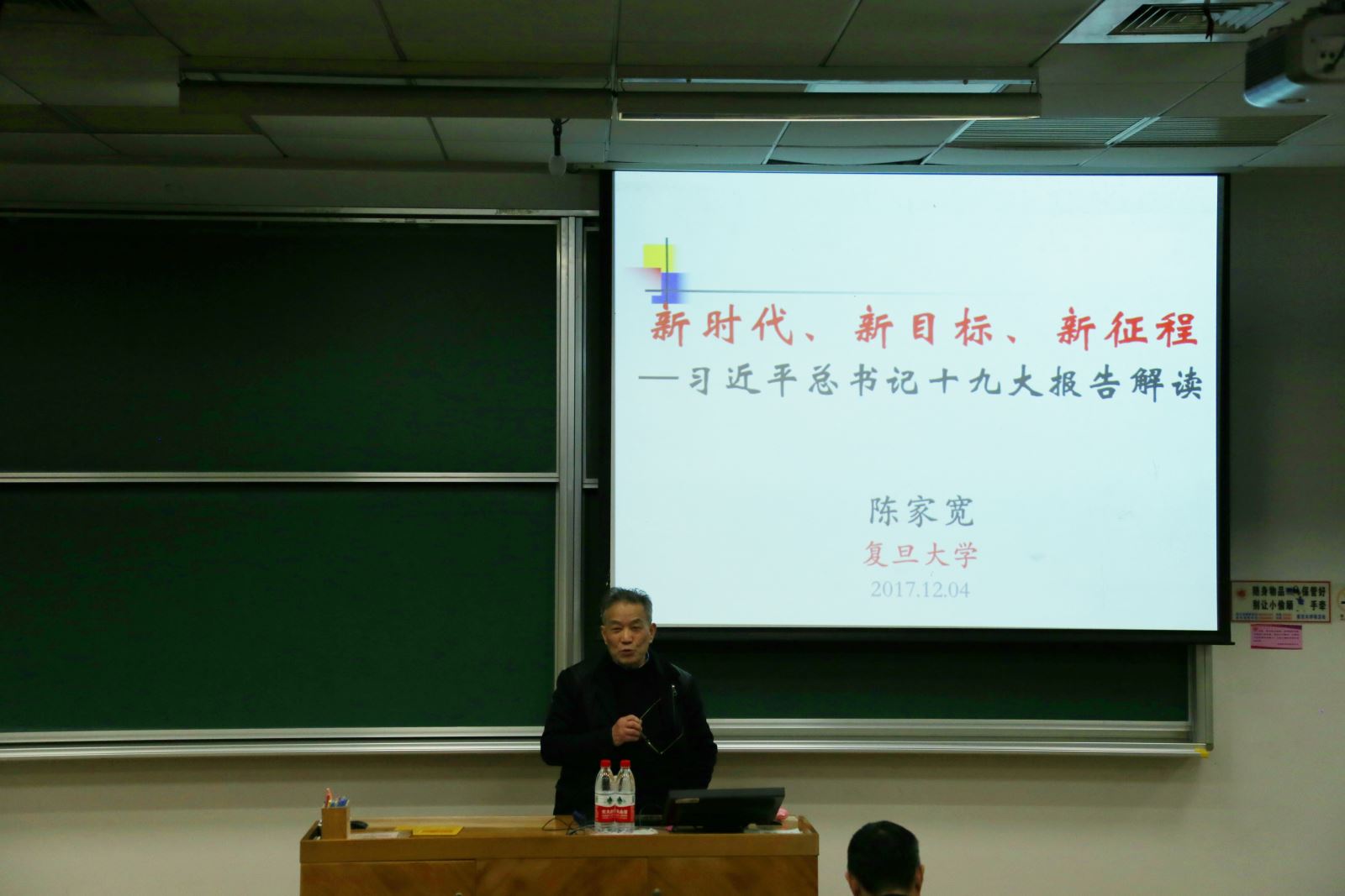 陈家宽教授以“新时代、新目标、新征程”为题与参会师生分享了他对十九大精神的解读。陈家宽是生态学领域专家,他自身的经历就是中华民族从站起来、富起来到强起来的见证。他指出,习近平总书记所作十九大报告、中国共产党章程(修正案)、十八届中央纪律检查委员会工作报告及其决议是一个有机的整体,相互联系又有明确分工,必须要全面解读才能深刻理解十九大精神。随后,他对十九大报告的框架和结构进行了分析,结合丰富的数据、案例梳理了十九大报告的四大重要理论贡献:“新时代”的重大判断及其定位、“主要矛盾”的重大判断、中国共产党的使命与“新时代”的战略安排、新时代中国特色社会主义思想等。同时,他还向大家介绍了复旦学者对中国特色社会主义理论体系做出的努力,勉励大家在新时代做出复旦人的新贡献。