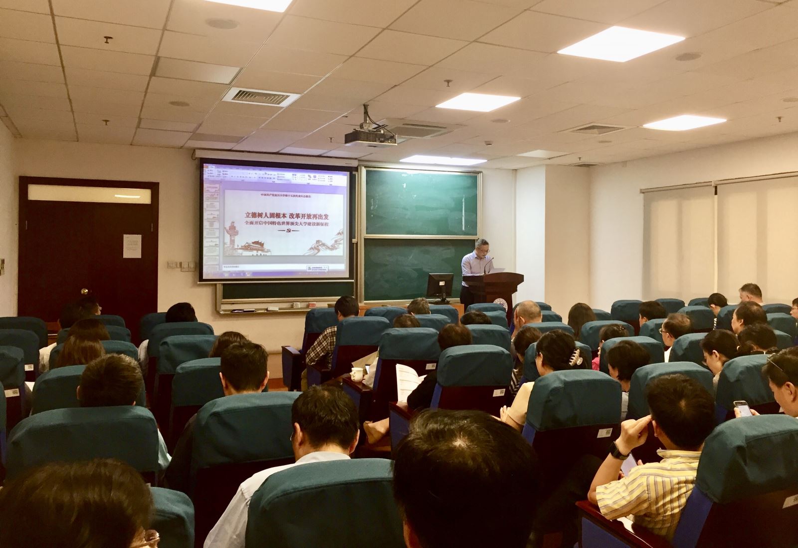 2018年10月9日下午,复旦大学数学科学学院组织全体教职工在光华楼东主楼2001室开展教职工理论学习活动,传达全国教育大会和复旦大学第十五次党代会精神,部署全院师生进一步学习和贯彻全国教育大会和校党代会精神的具体工作。院长陈猛主持学习活动。