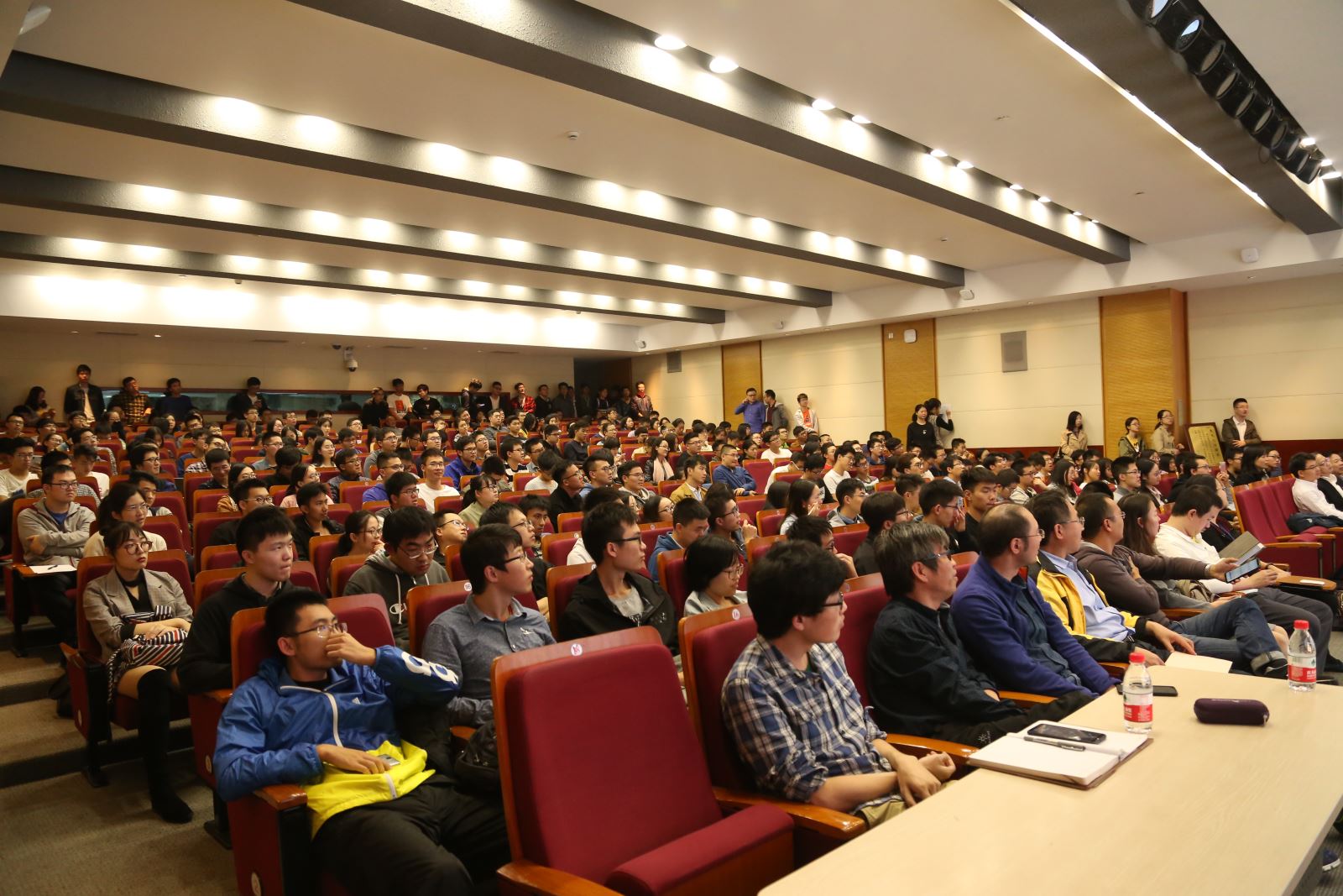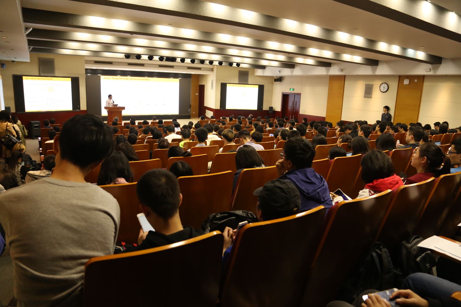 范剑青教授分享了自己身为八个学科教授的体会,指出了数学正是跨学科交流的工具。回顾人工智能的发展历程,他着重提出AI是为了帮助人类解除繁重的重复性工作而不是替代人类。范教授对人工智能和机器学习作了区分,并以图像识别和机器翻译这两个领域作为案例,说明当前人工智能发展迅速得益于大数据的收集和现代计算技术的发展。他分析了统计中的非参数模型和深度学习的结合,诞生了包括CNN和RNN模型在内的人工智能领域成功案例,应用领域的大量实践也将推动统计学科未来的发展和挑战。在互动环节,同学们就数据获取、数学基础知识储备等问题向学长请教探讨,范教授一一作答。听众们受益匪浅,不少学生站立着听完整场报告。
