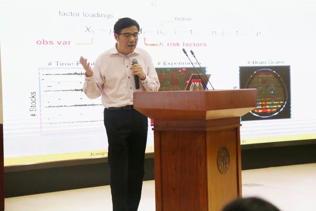 数学科学学院院长陈猛教授主持讲坛,并简要介绍了范剑青教授的研究领域和学术成果。范剑青教授现为国际统计学会、国际数理统计学会、美国统计学会、美国科学促进会、计量金融学会等学术组织会士,主要研究领域为高维统计、机器学习、大数据科学、经济学、金融学、生物信息等,现为国际统计概率领域多家期刊主编、副主编。范剑青教授于2000年获得COPSS总统奖(国际统计学领域最高奖项),2006年荣获洪堡基金会终身成就奖,2007年荣获晨兴华人数学家大会应用数学金奖,2013年获泛华统计学会许宝禄奖,2014年荣获英国皇家统计学会授予的“GuyMedal”银质奖章,2018年美国统计学NoetherAward。