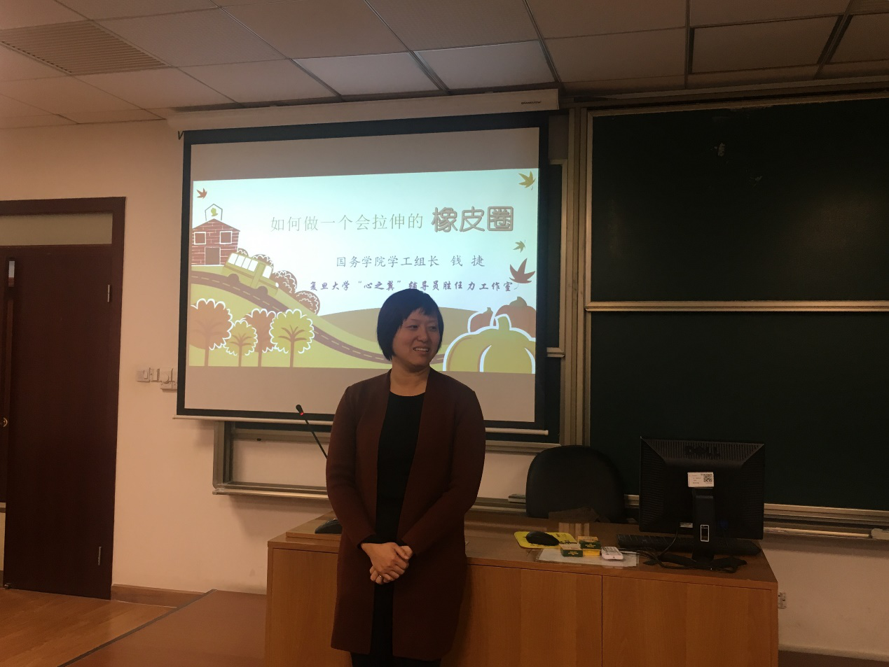 11月27日下午,学院邀请国务学院学工组长钱捷老师面向学院辅导员和2017级专业学位研究生开展了一场“如何做一个会拉伸的橡皮筋”为主题的主题培训,钱老师和参与培训的老师和同学分享了压力排查及疏导的相关知识,并与同学们展开了丰富的互动和交流。她从自身的学习经历出发,分析了专业硕士容易产生心理压力的原因以及大家可能面临的心理压力,解释了什么是压力,20种存在压力的迹象等。通过互动,大家谈了自身的感受和经历,并收获了疏解压力的方法和诀窍。