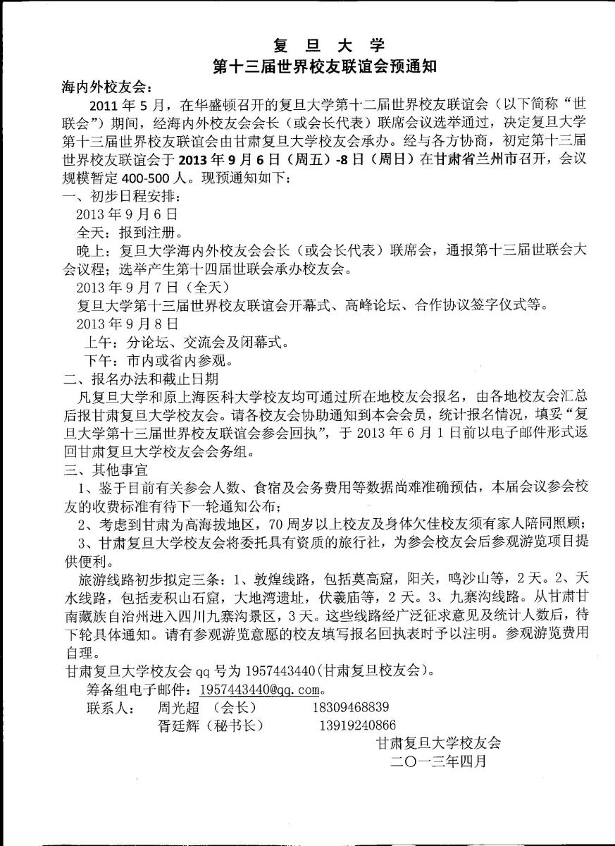关于转发报名参加“复旦大学第十三届世界校友联谊会”的预通知