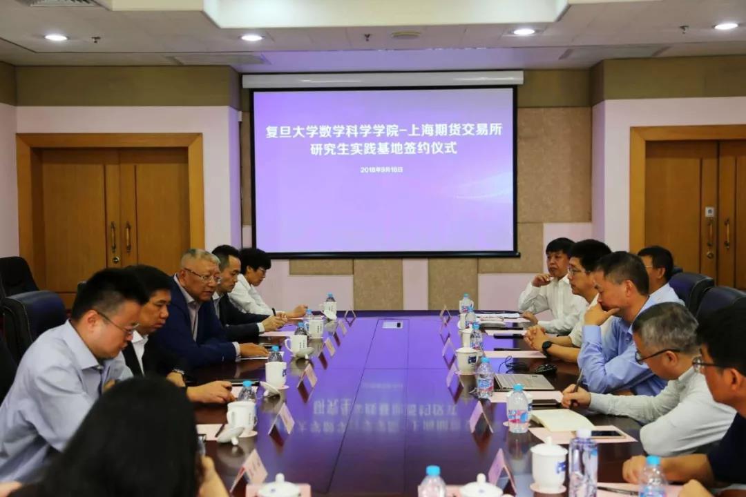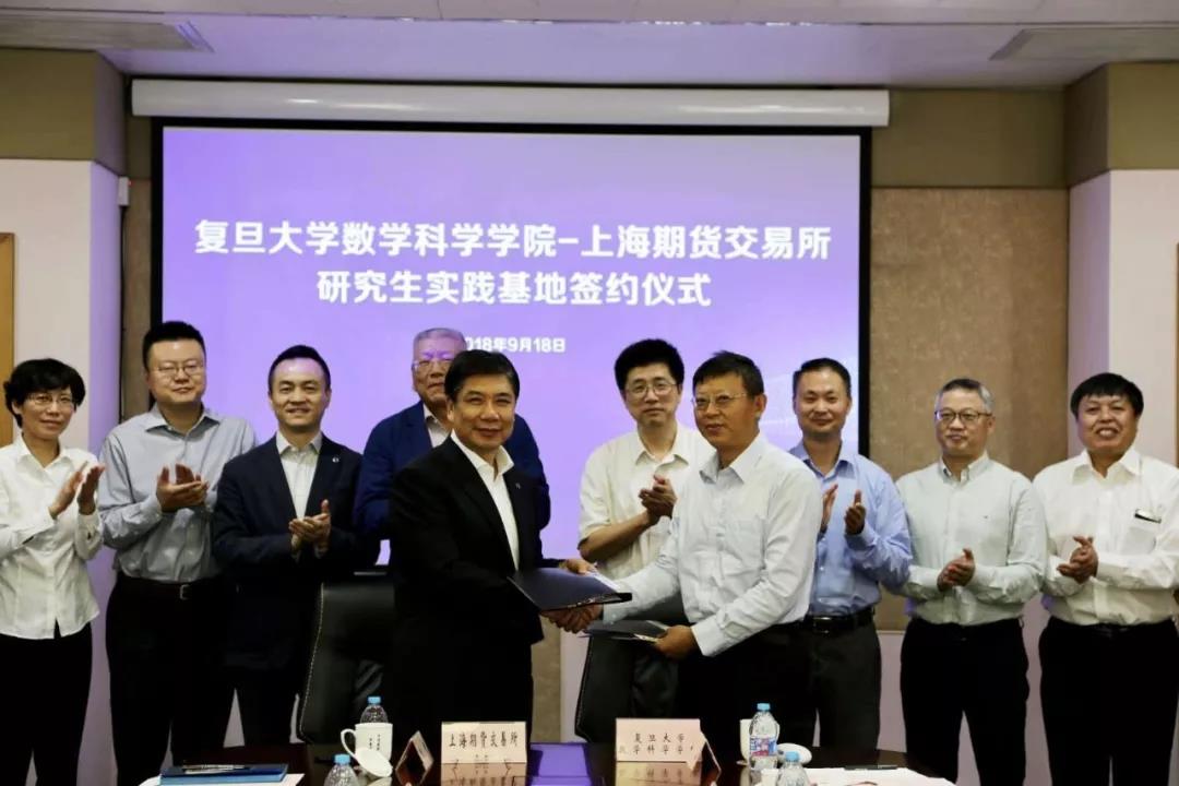 9月18日上午,复旦大学数学科学学院与上海期货交易所共建研究生实践基地签约仪式在逸夫科技楼举行。复旦大学校长助理徐雷,研究生院常务副院长吴宏翔,数学科学学院院长陈猛,党委书记王永珍,上海期货交易所党委书记、理事长姜岩,党委委员、副总经理叶春和等领导和嘉宾出席仪式,数学科学学院党政领导及教师代表、上海期货交易所各部门负责人参加仪式。