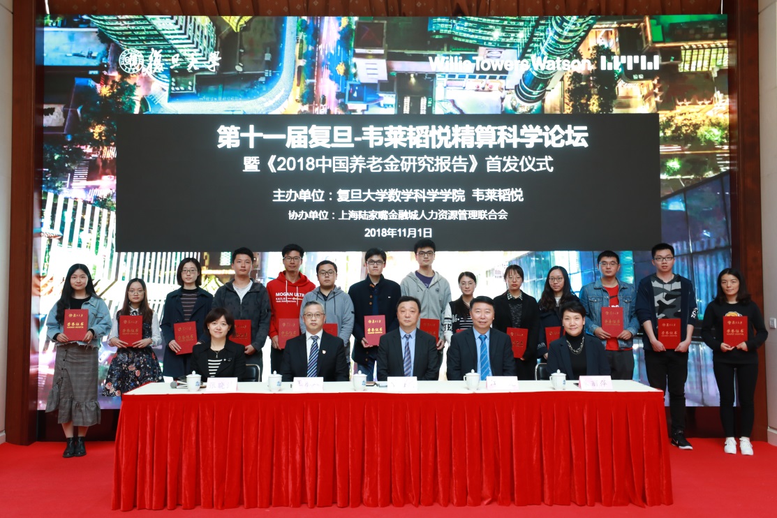 王永珍在致辞中对韦莱韬悦公司二十年来对复旦大学数学科学学院和复旦精算学科发展的持续支持表示感谢,希望继续加强双方的合作和交流。伍海川在致辞中向获得韦莱韬悦奖学金的同学表示热烈祝贺,希望在韦莱韬悦精算科学基金支持下复旦能培养出更多的精算科学人才。14名获奖学生上台接受本学年奖学金证书,并与颁奖嘉宾合影留念。